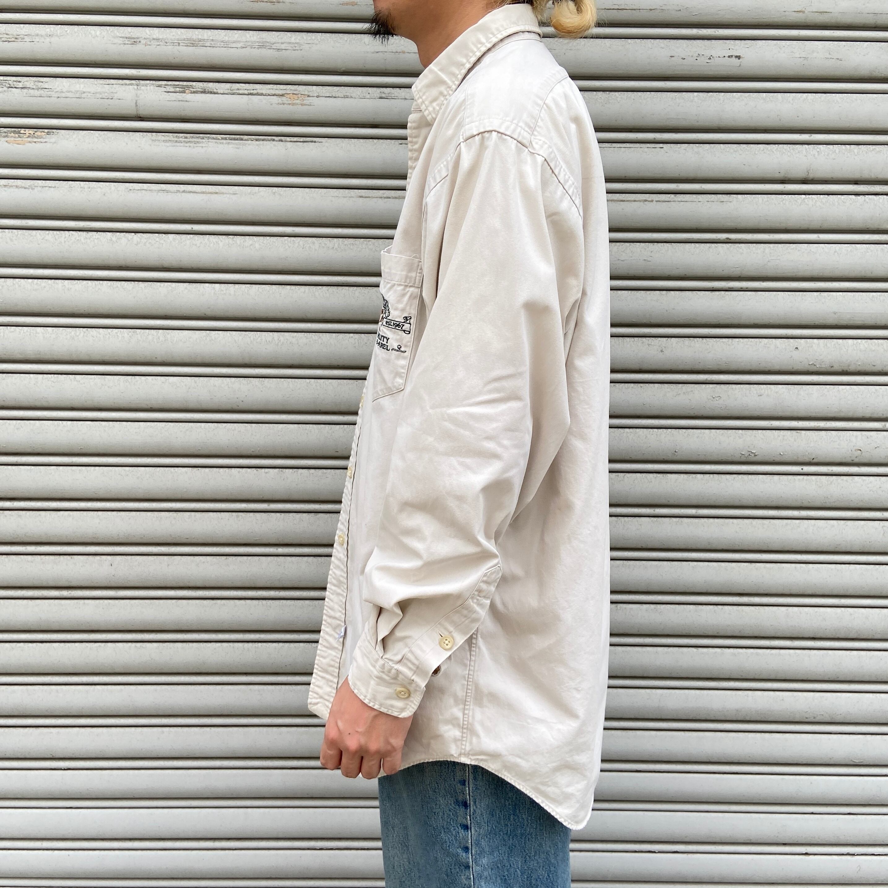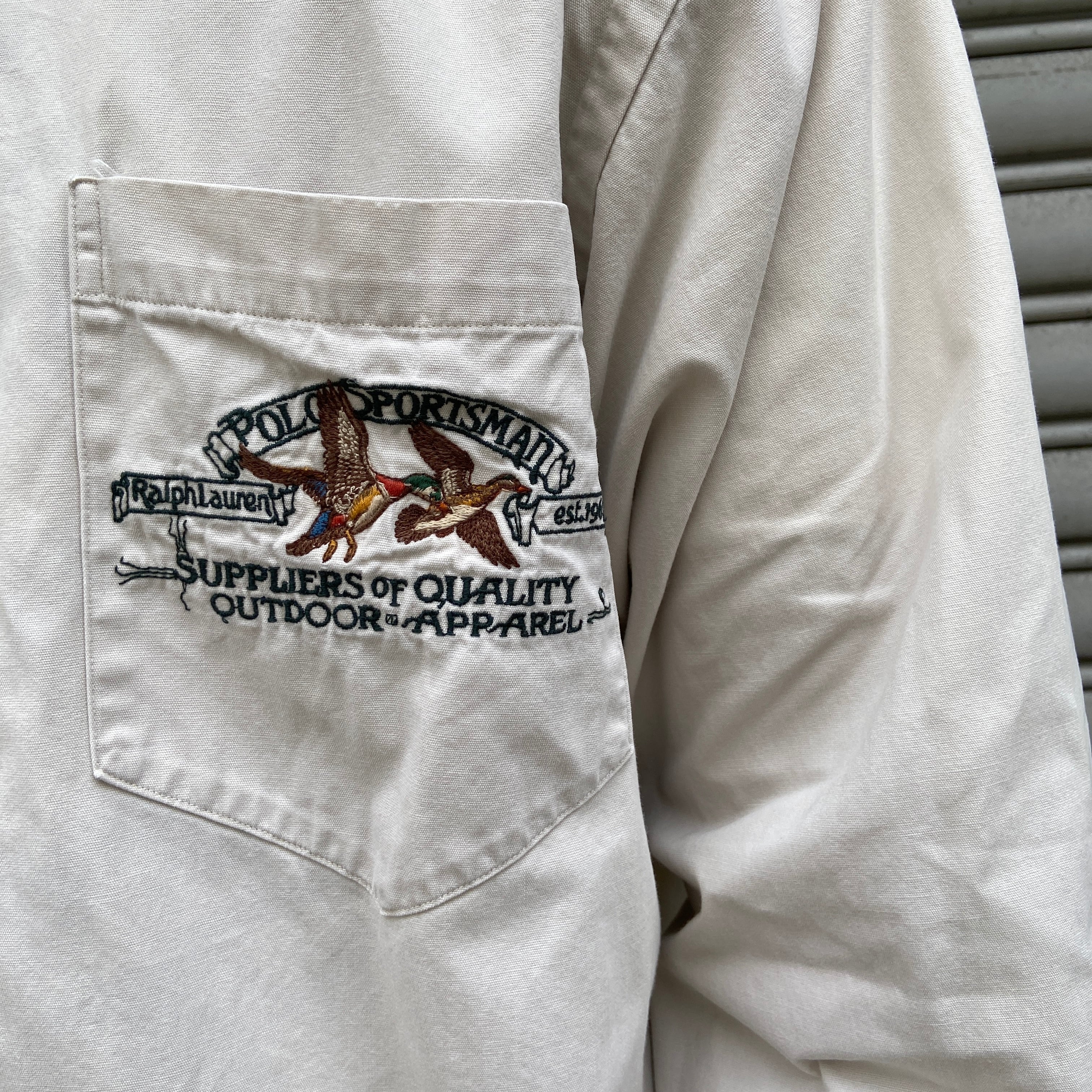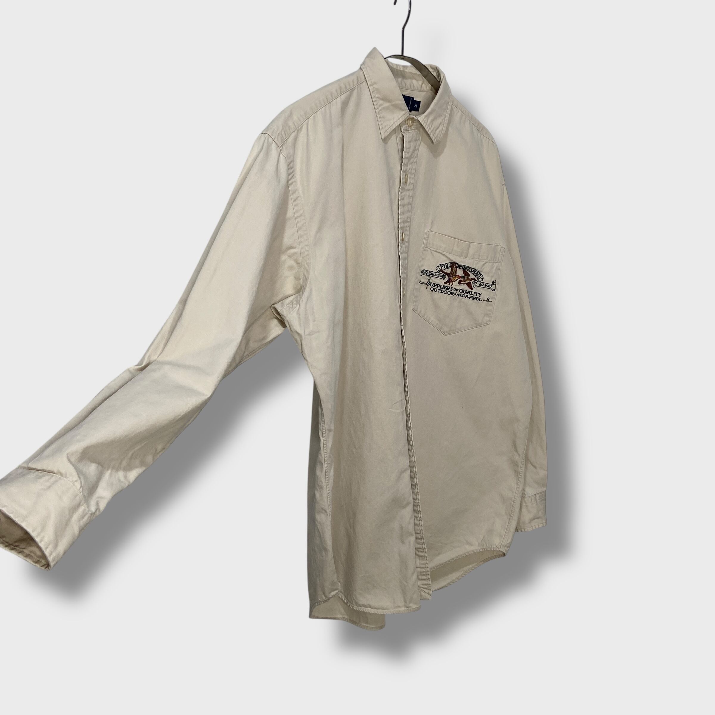 90年代ラルフローレンのポロスポーツマン、カモ柄刺繍長袖シャツになります。