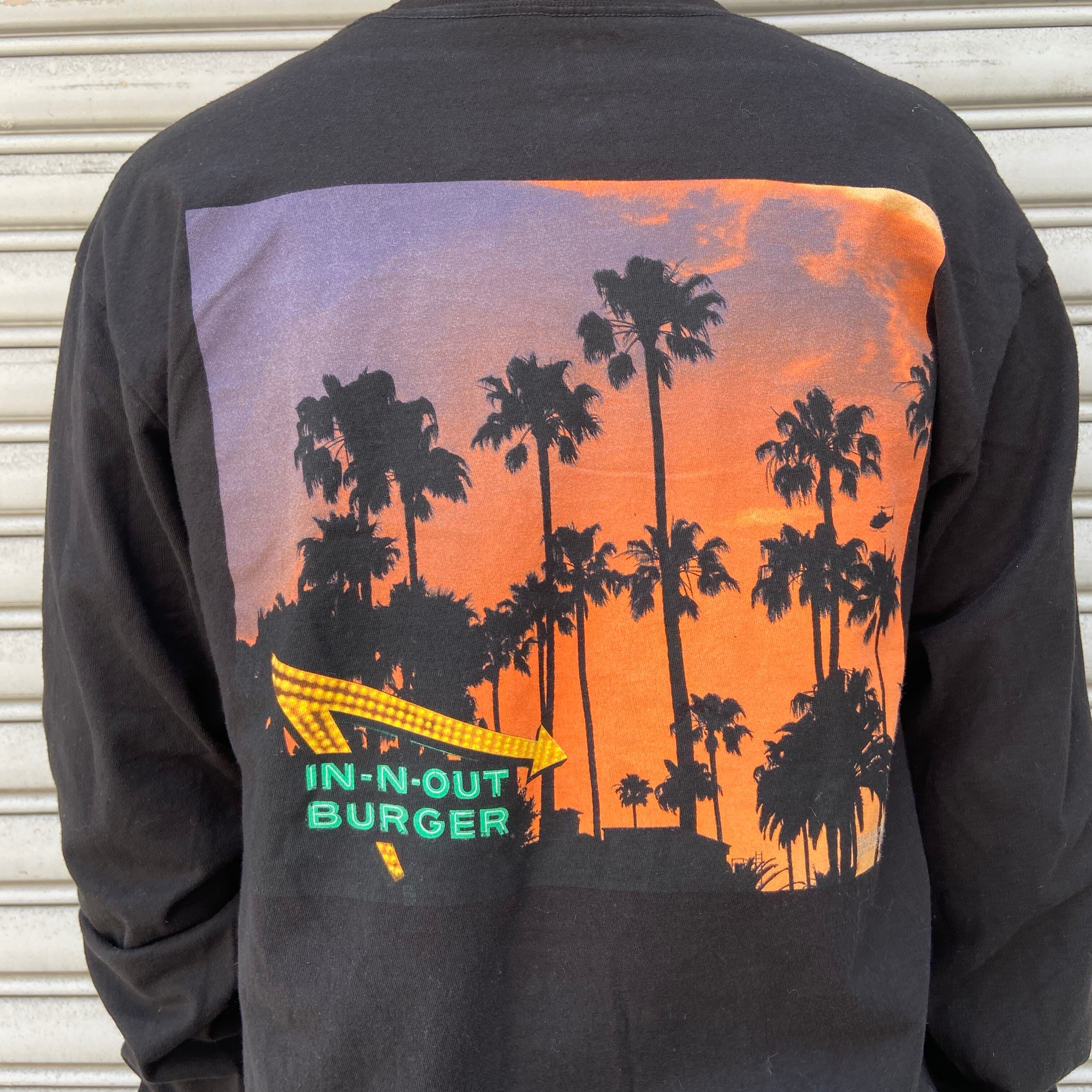 カリフォルニア州を中心に店舗を展開している人気ハンバーガーショップ。バックプリントにカリフォルニアの夕日とヤシの木が大判プリントデザインされてます^ ^