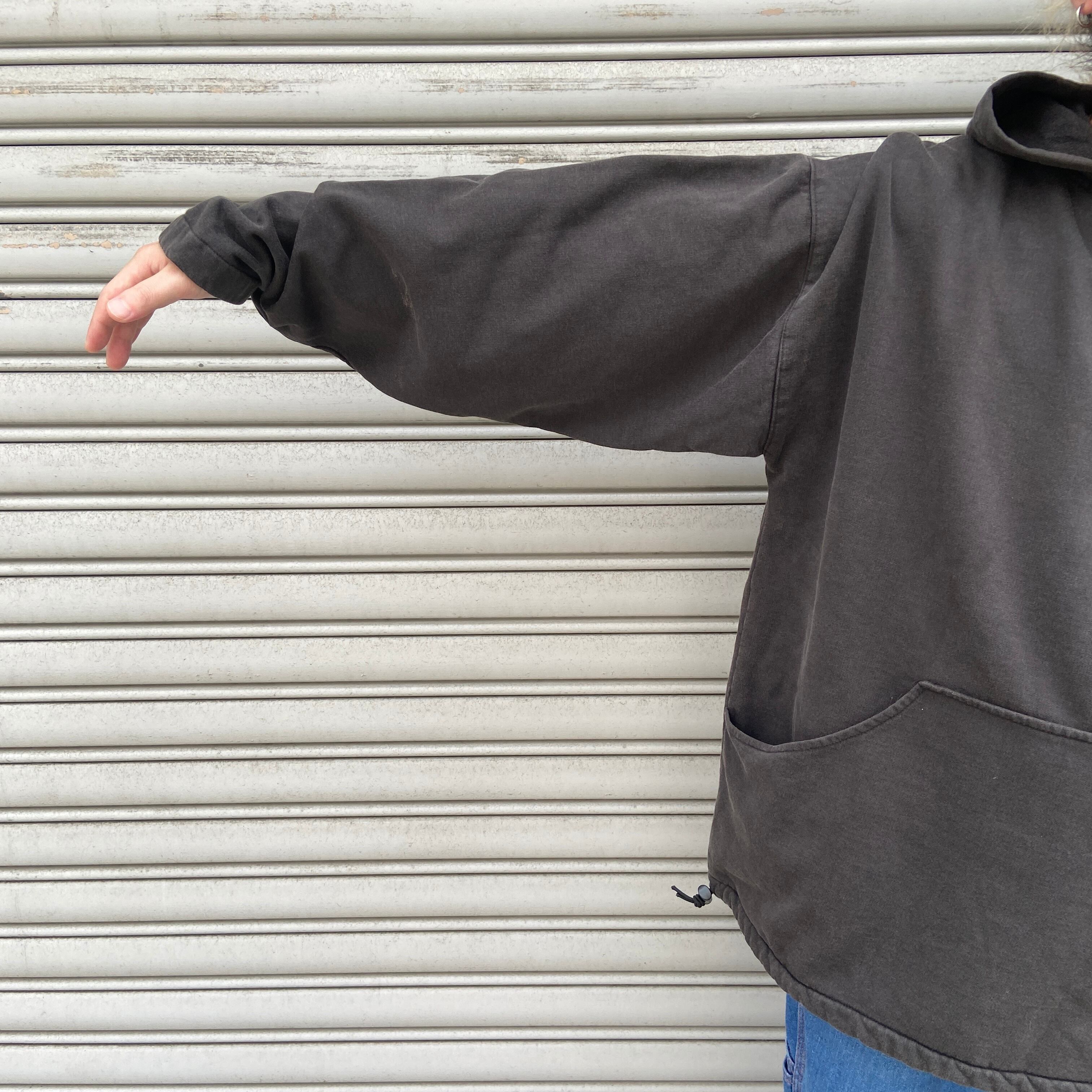 カンガルーポケット部分と右袖の肘と袖口近くと左袖口近くにブリーチ飛びのような痕があります。右袖に黒いシミ汚れ。全体的にフェードしています。