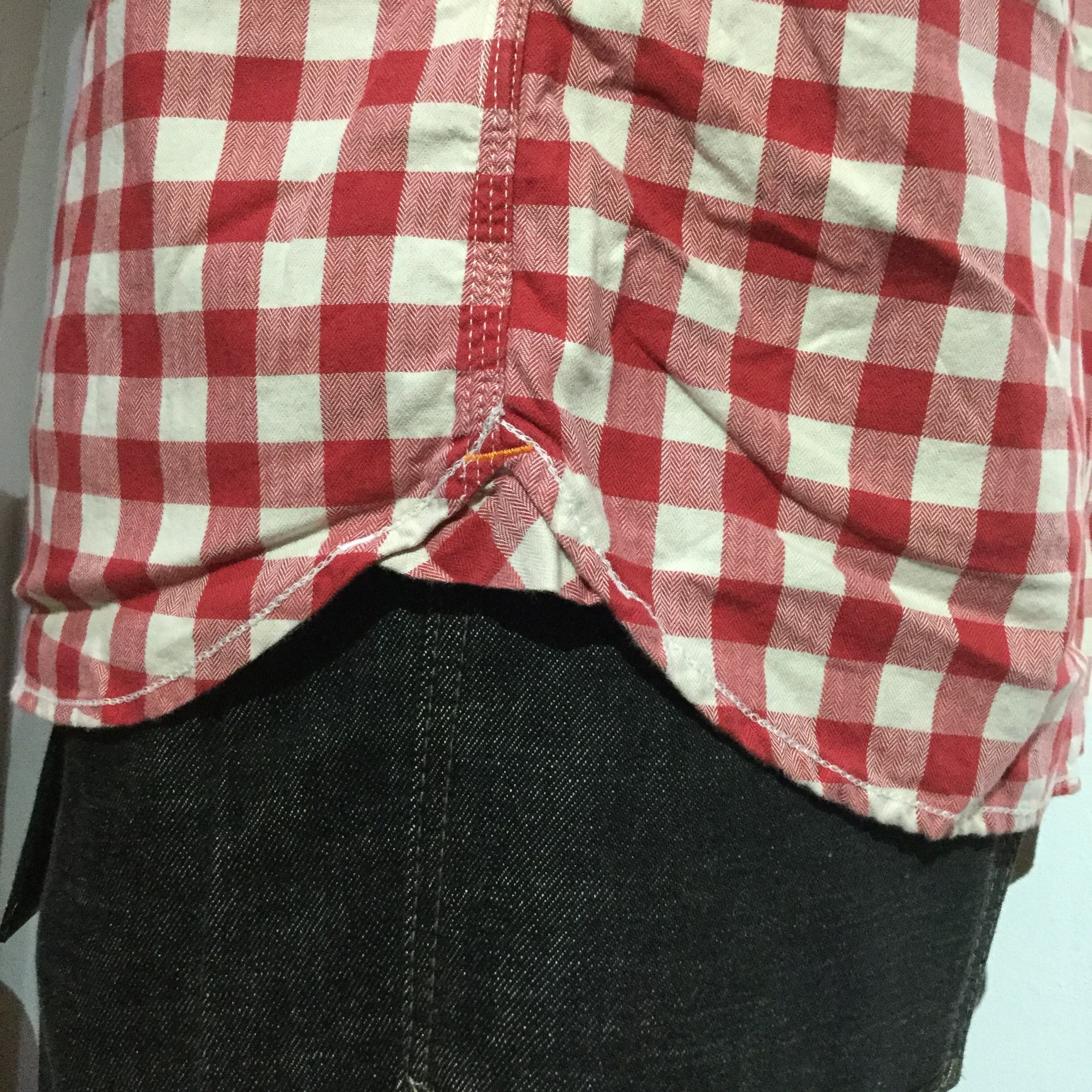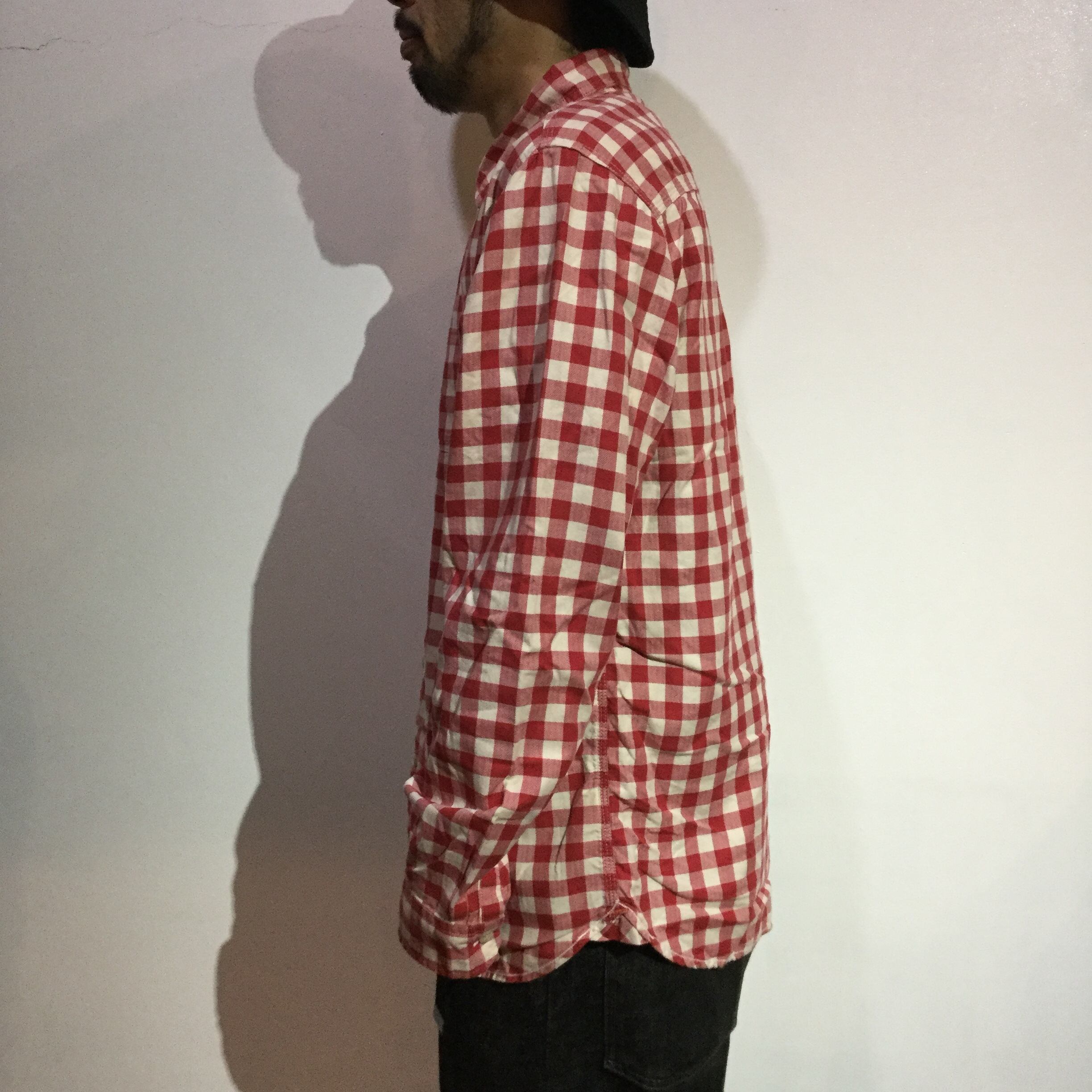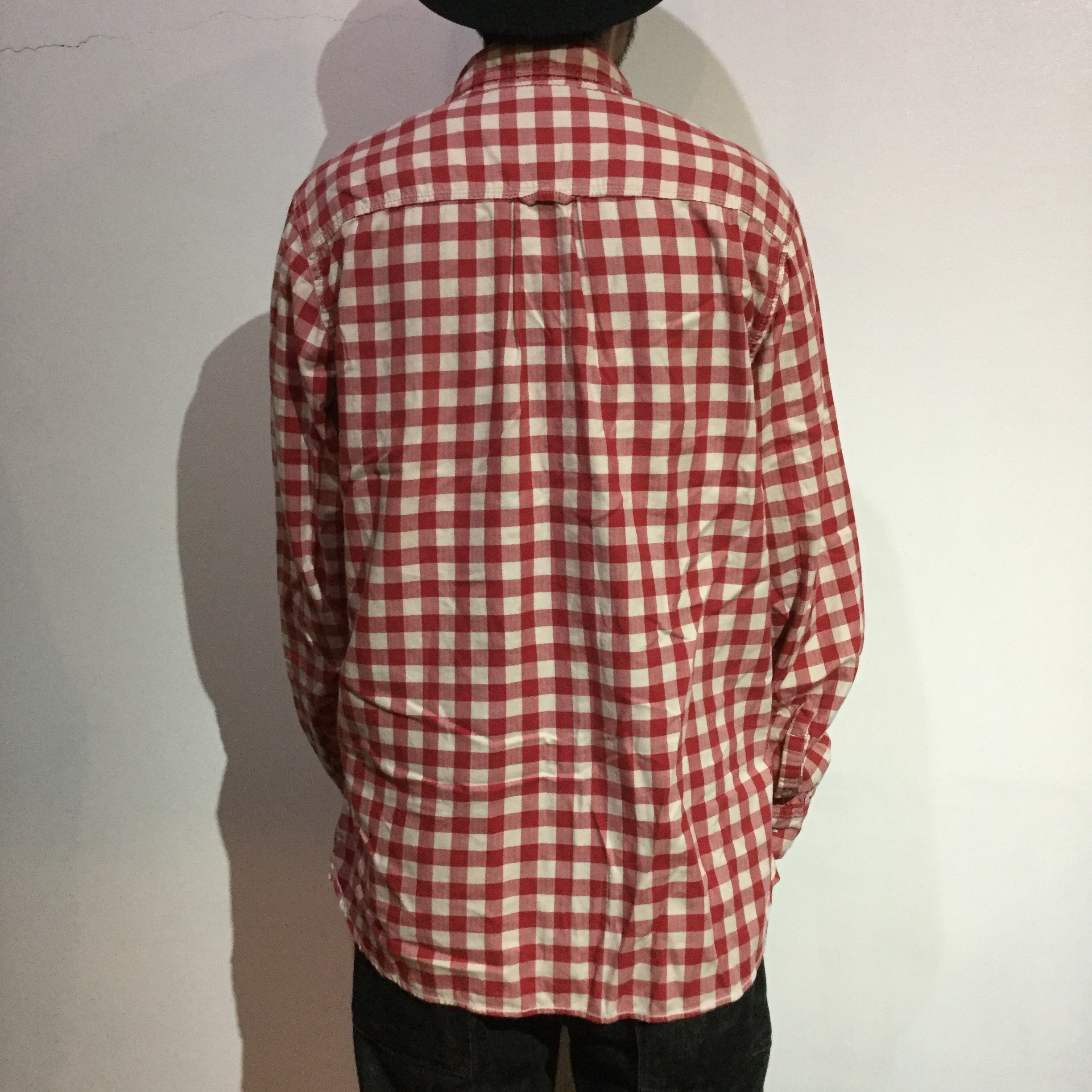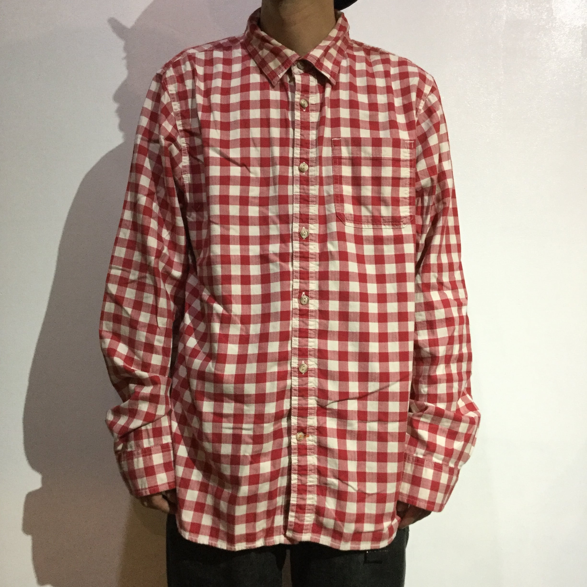 綺麗な赤白のチェック柄が入ったラウンドカットシルエットの長袖シャツです!