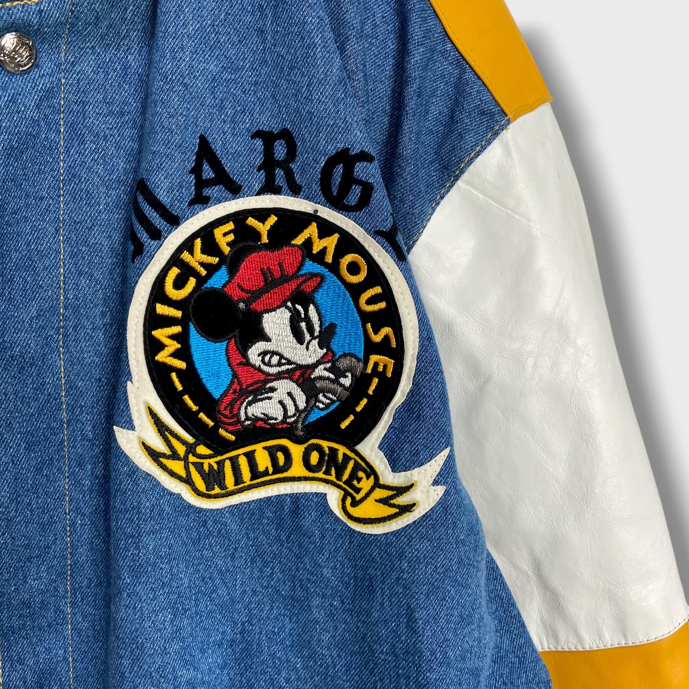 背面にインパクトのある大きなミッキーマウスのワッペンがデザインされています。同様のワッペンが胸元にもあります!