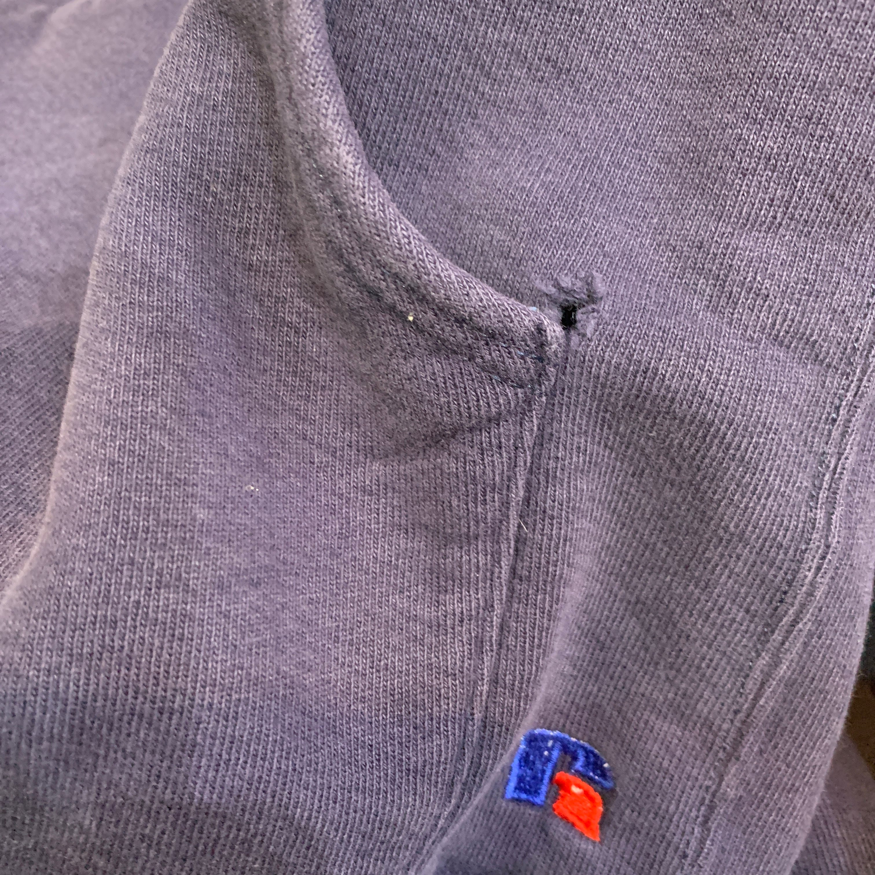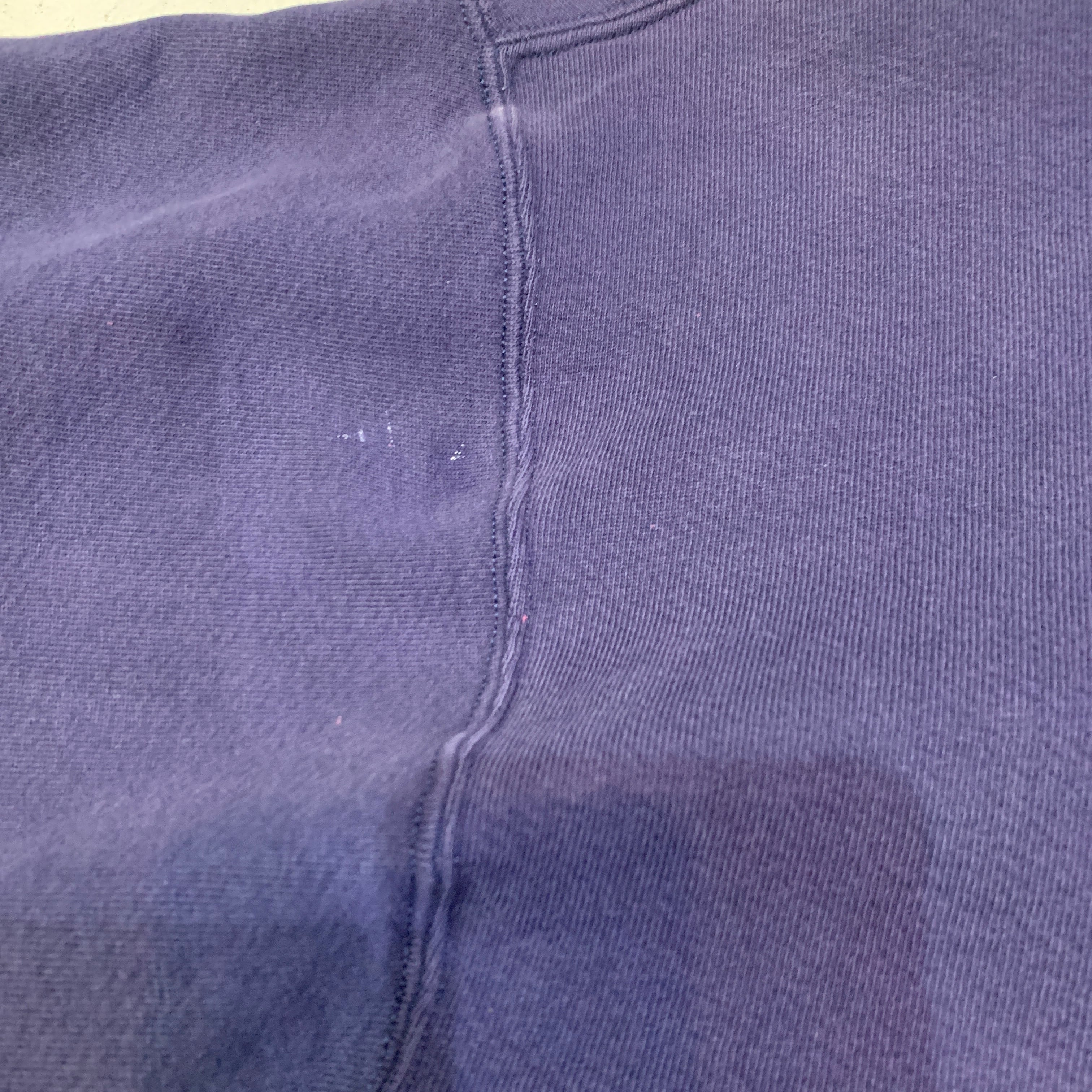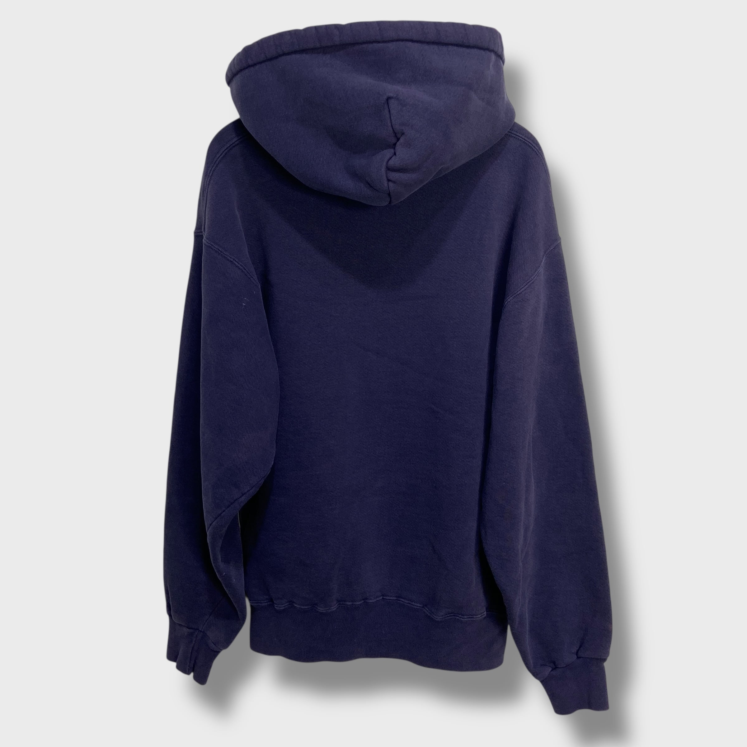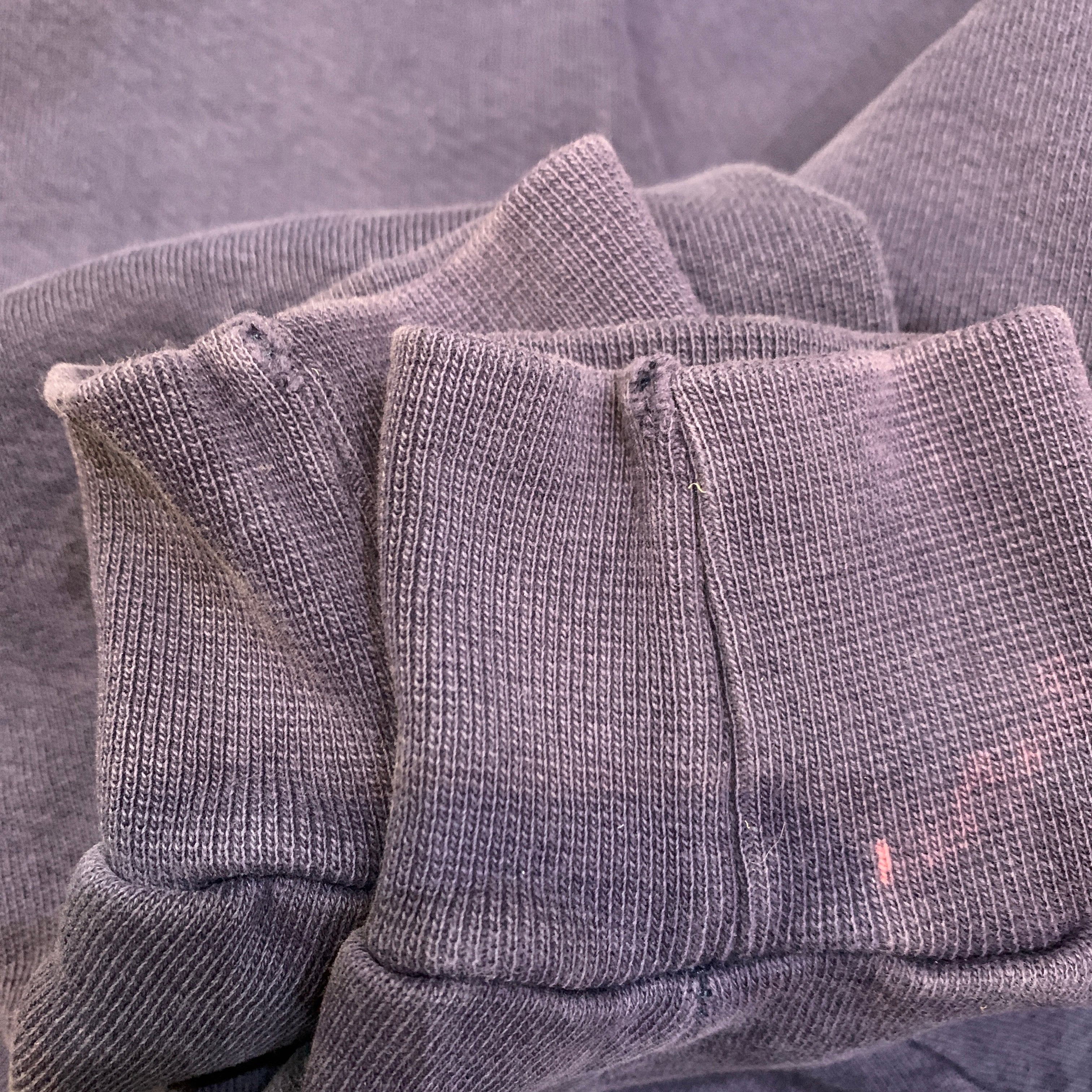 お腹ポケットの両サイドの付け根部分に小穴破れがあります。両袖のリブ先に小傷。左袖の後ろ側、袖の付け根部分とリブに白い小さな汚れ。全体的にフェードしてます。