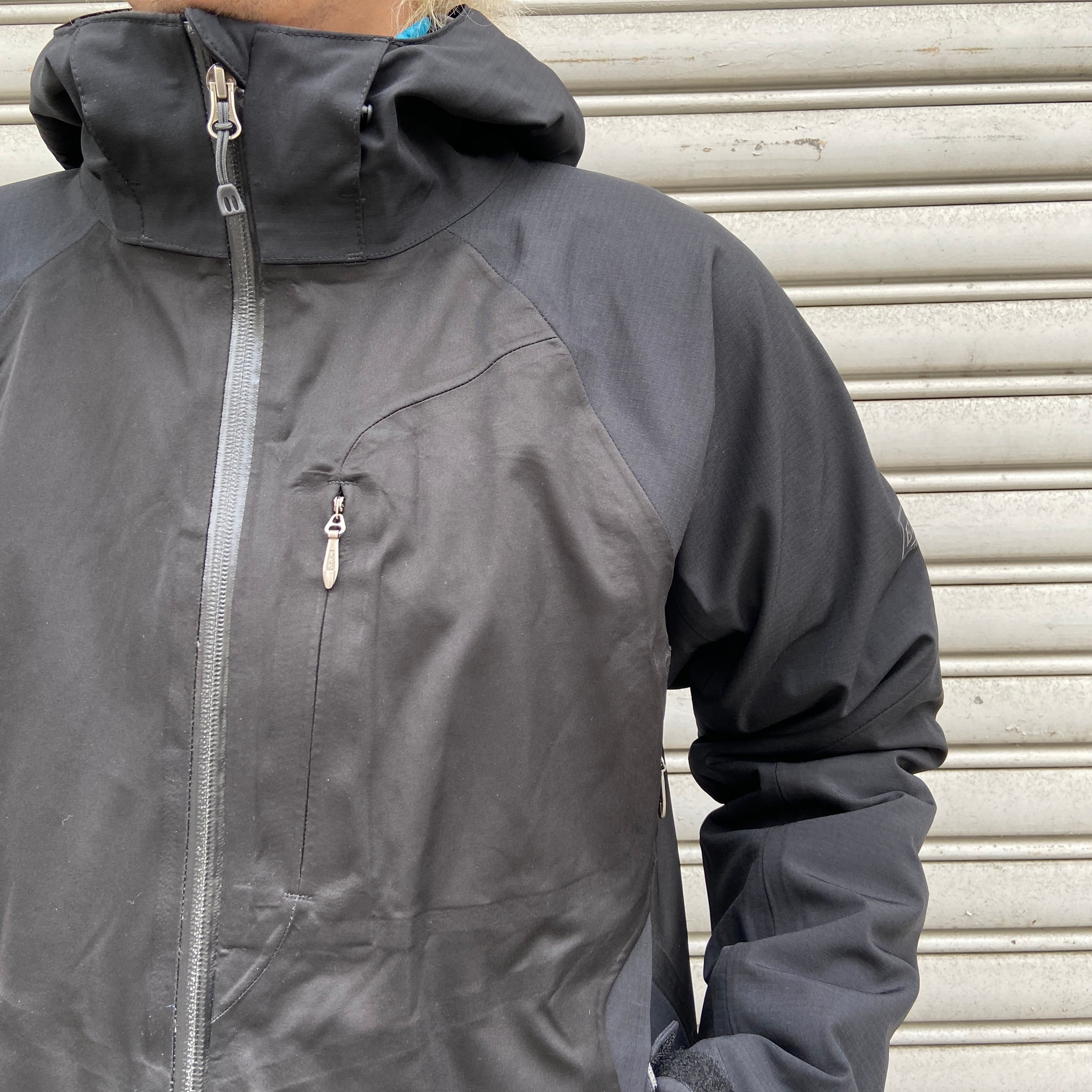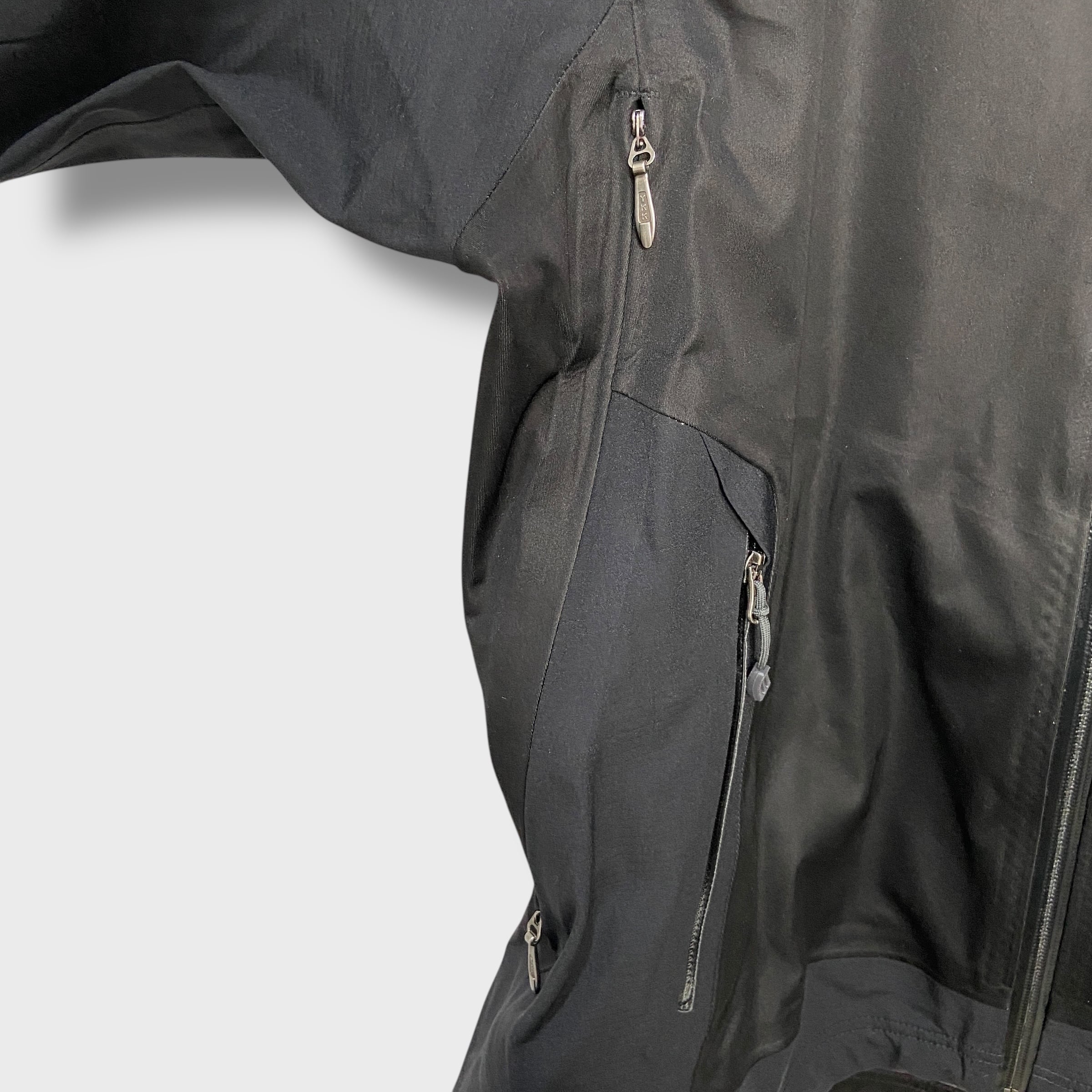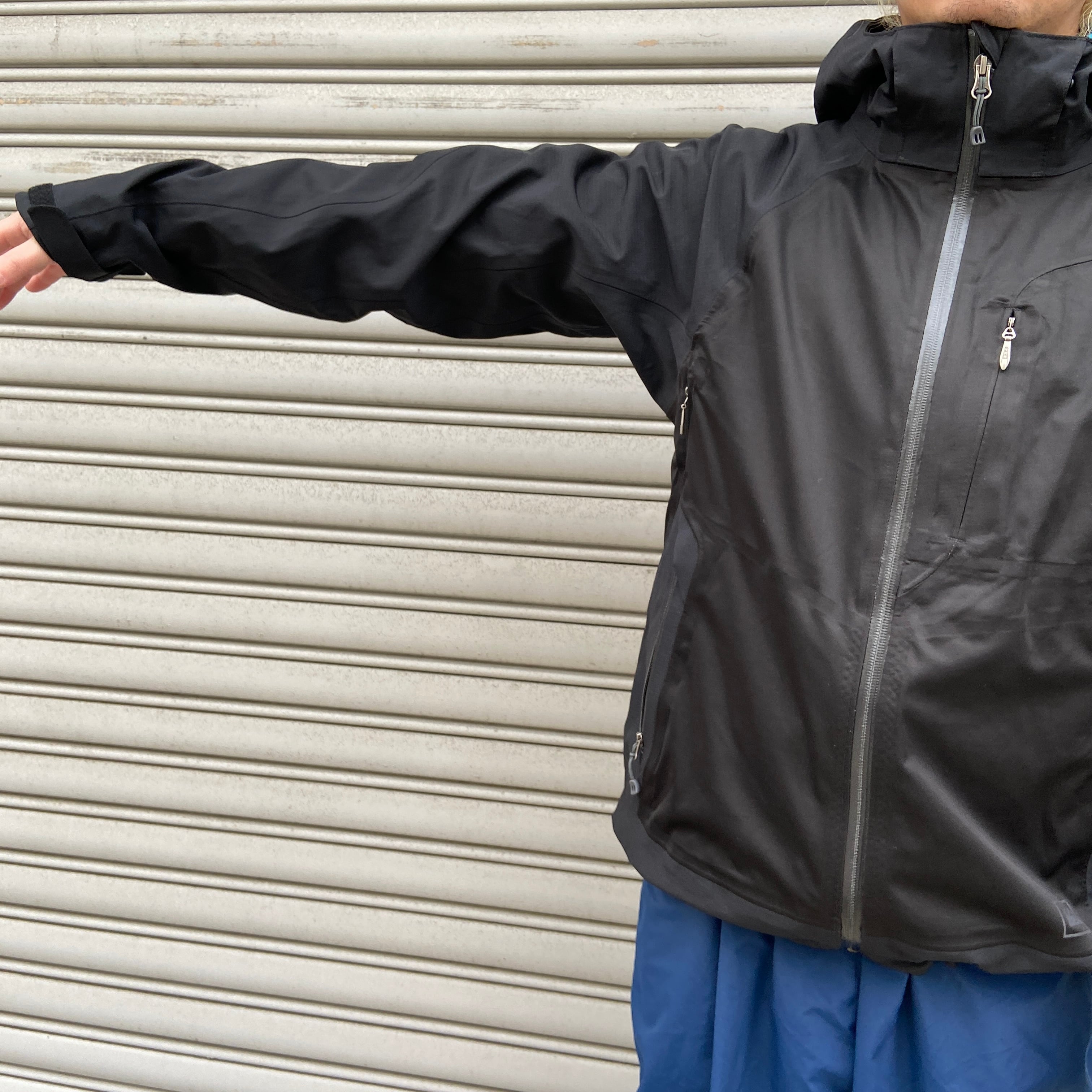 オールブラックのソフトシェルと伸縮性のある素材の切り返しデザインがカッコいいマウンテンパーカーです^ ^