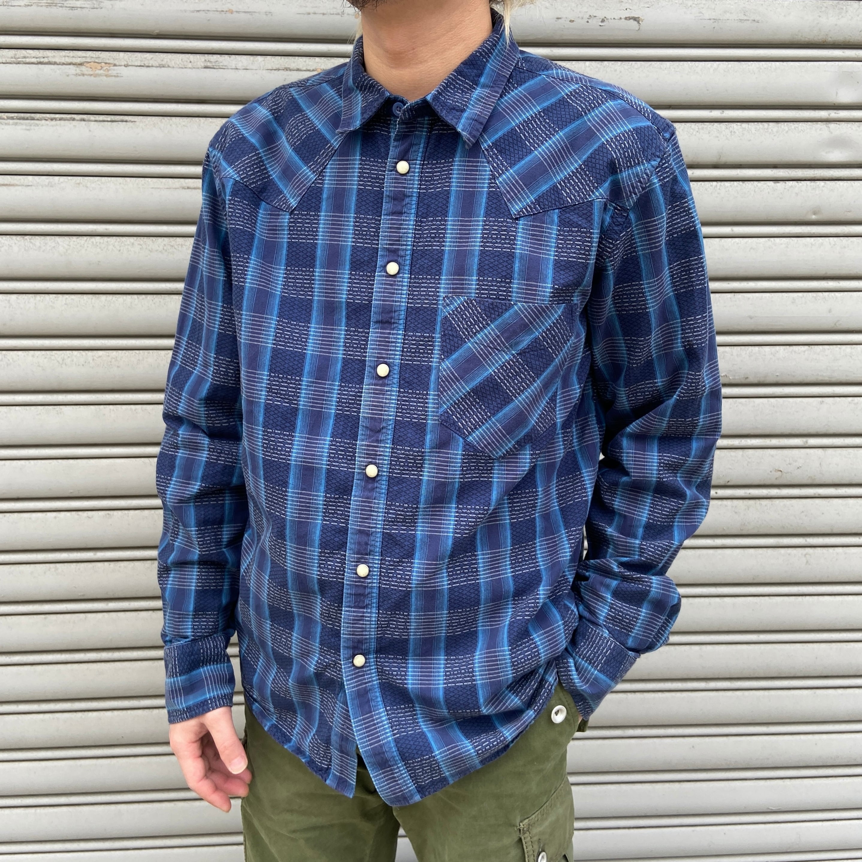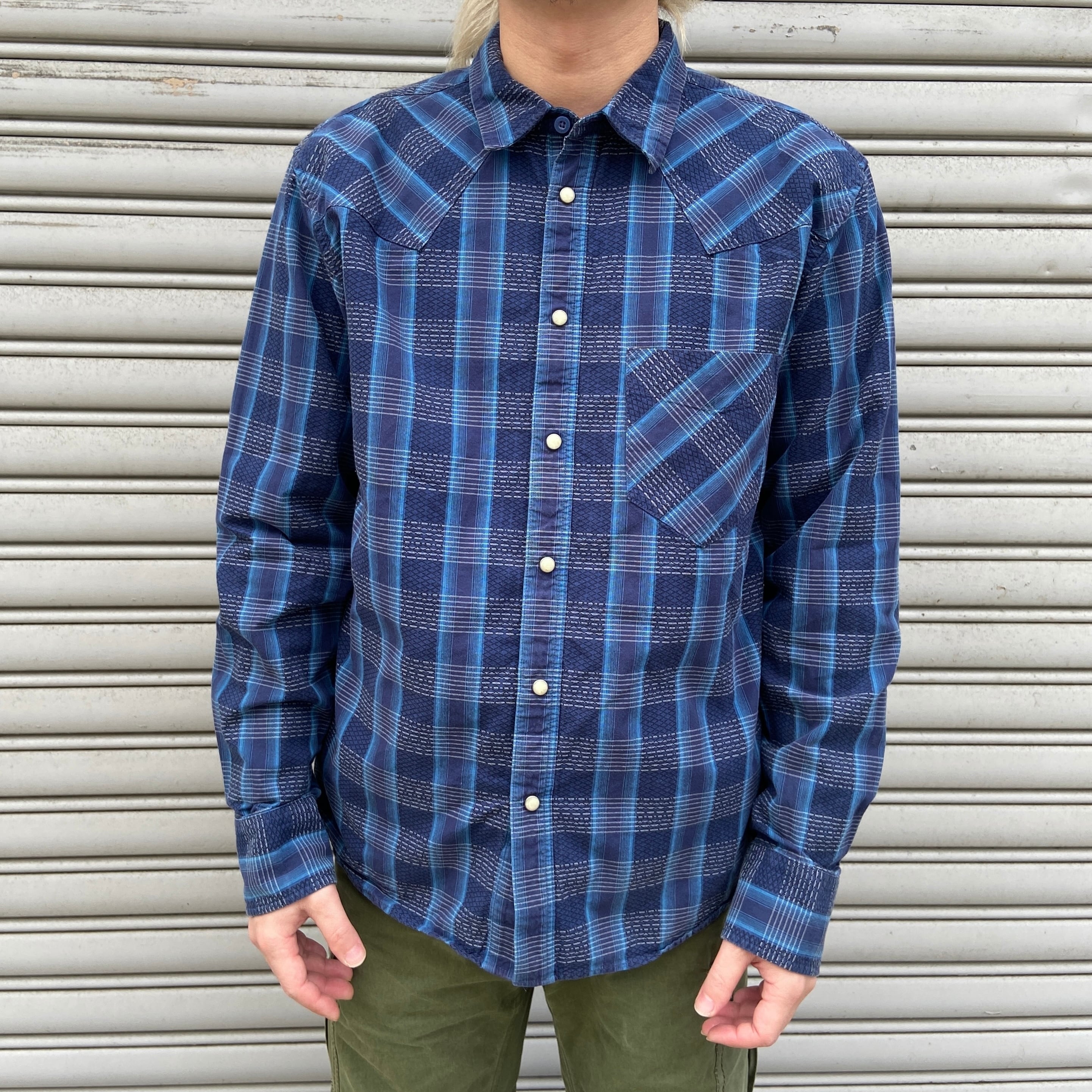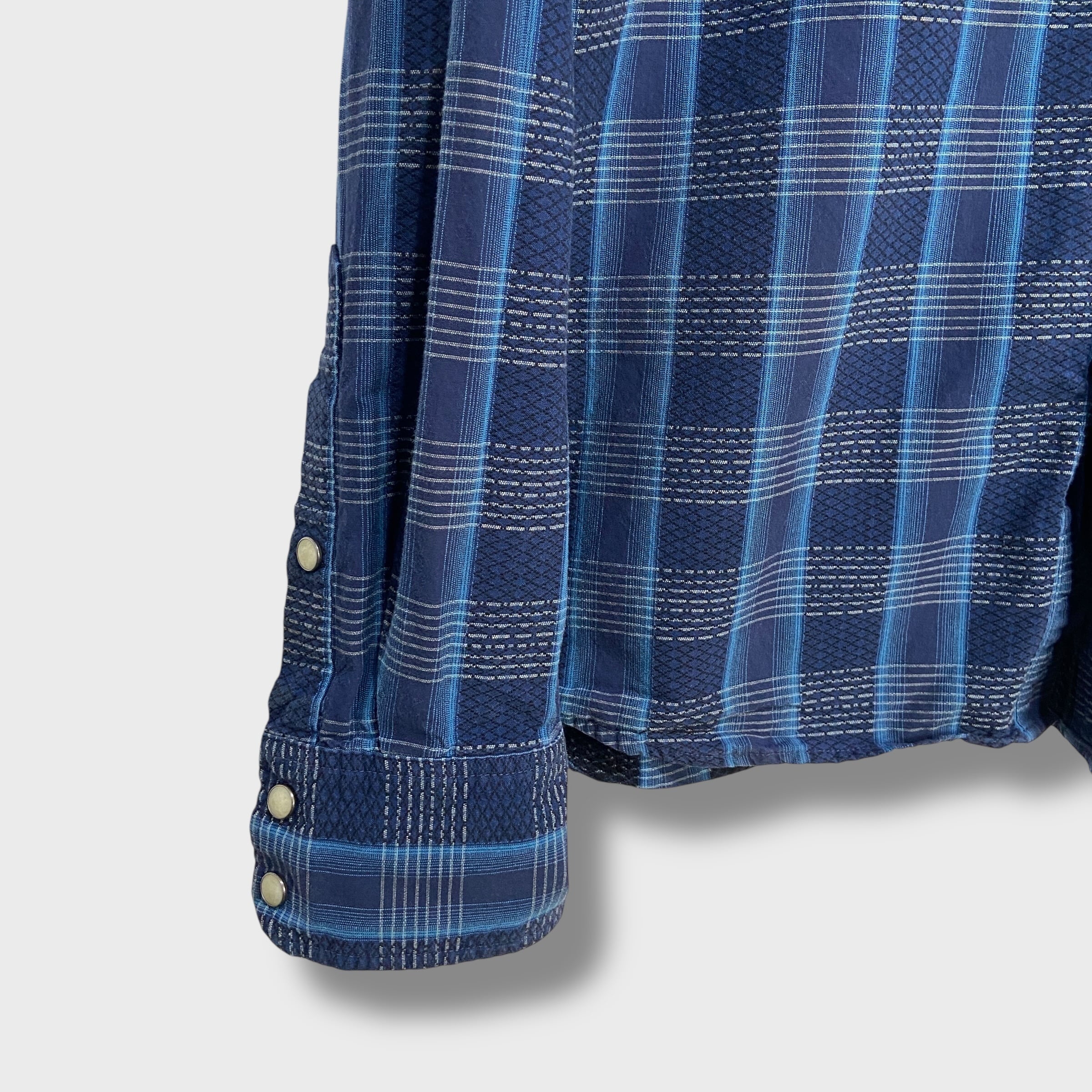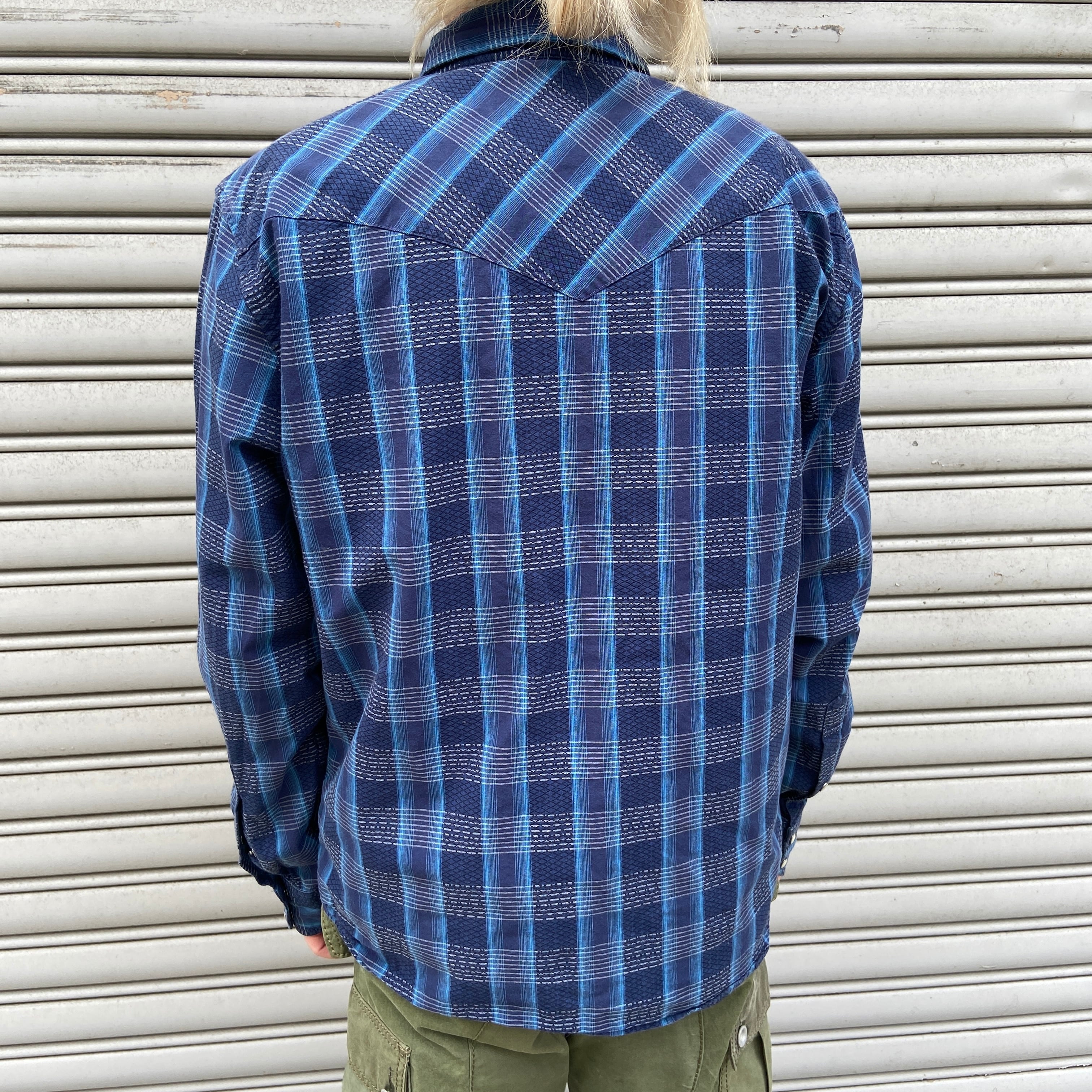 ブルー系のチェック柄にウエスタンヨークとスナップボタン仕様^ ^