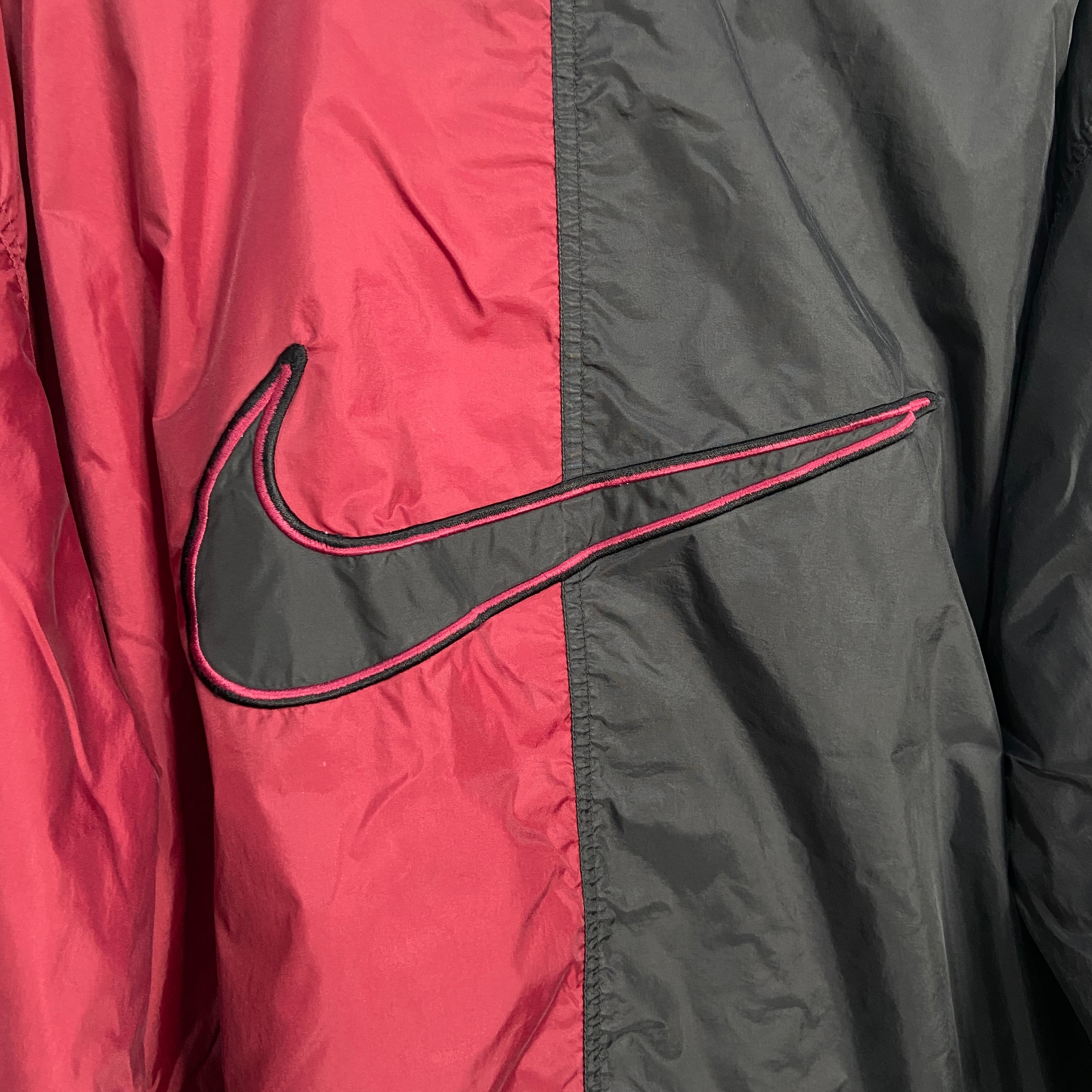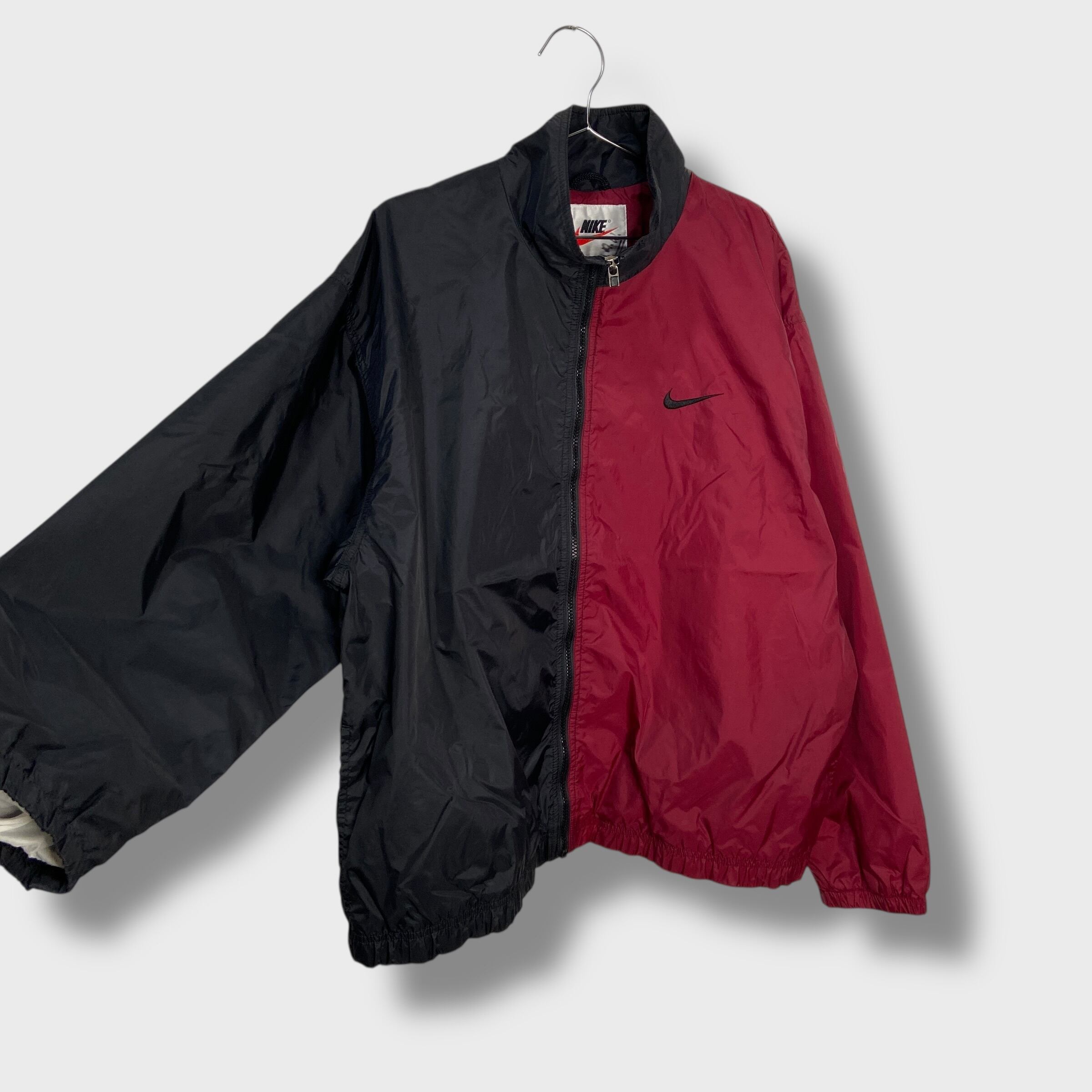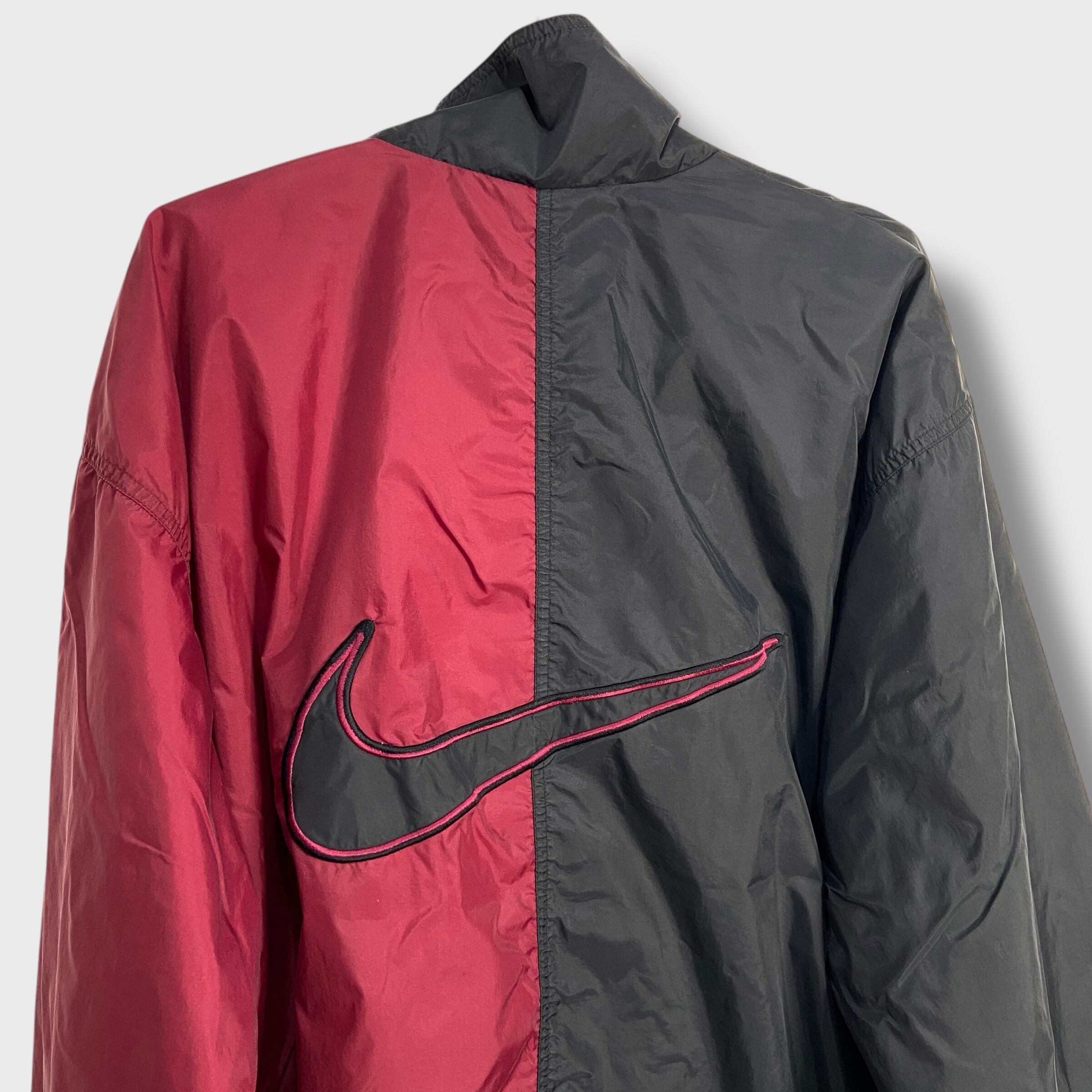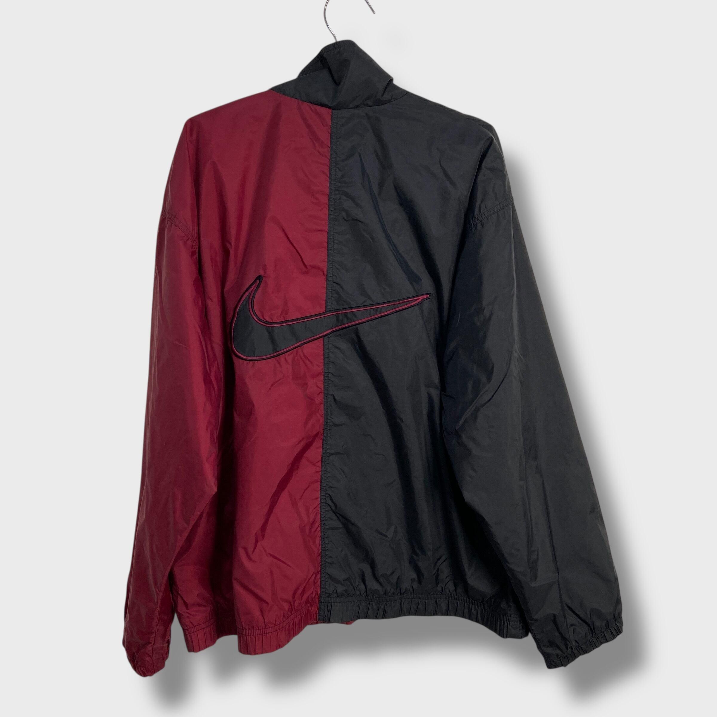 90s NIKE ツートンナイロンジャケット ビッグロゴ L エンジ 黒