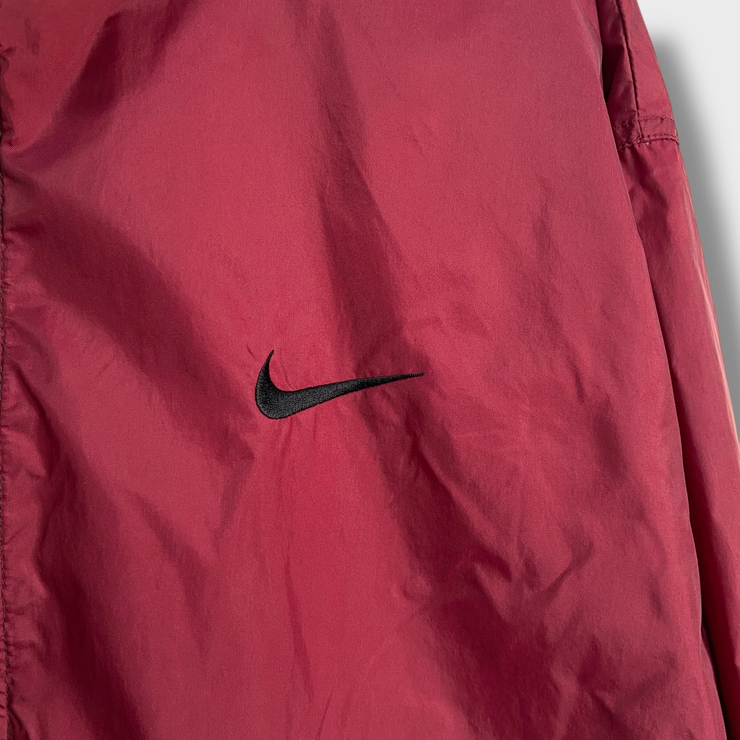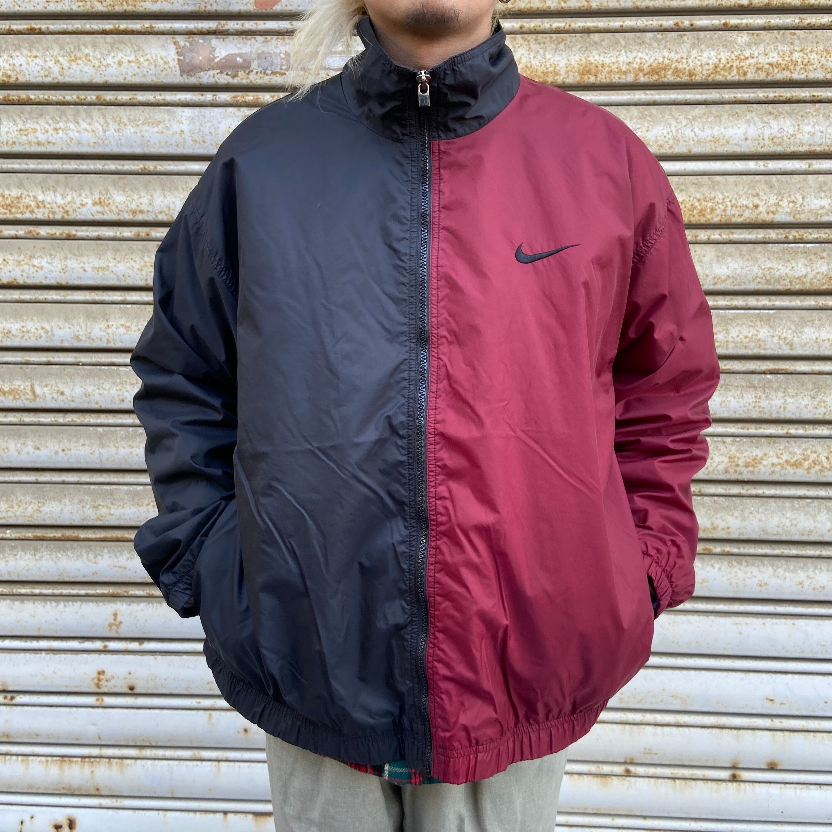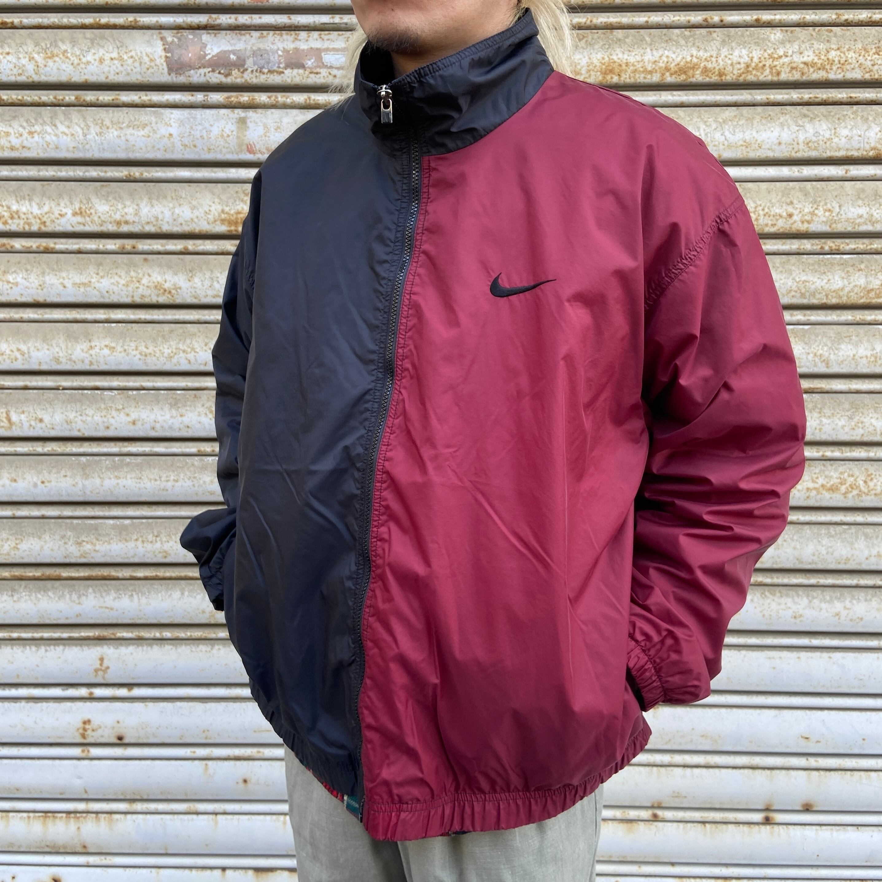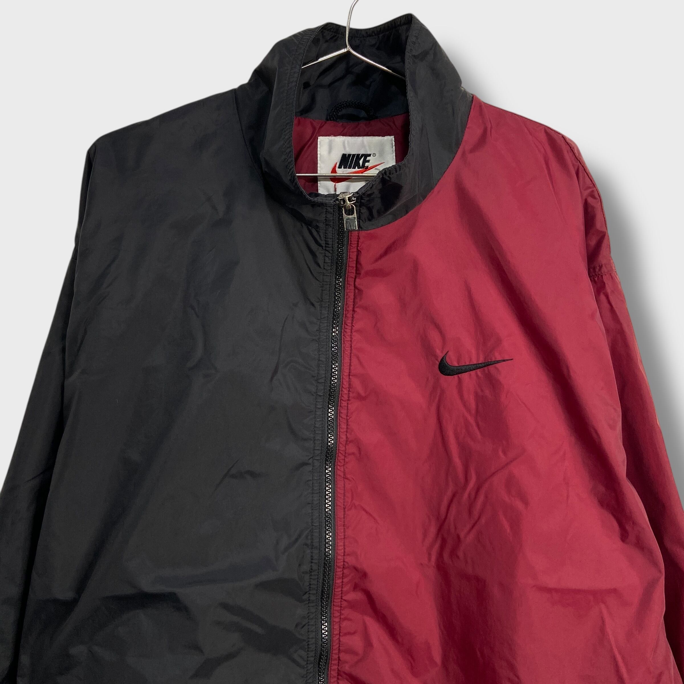 90s NIKE ツートンナイロンジャケット ビッグロゴ L エンジ 黒