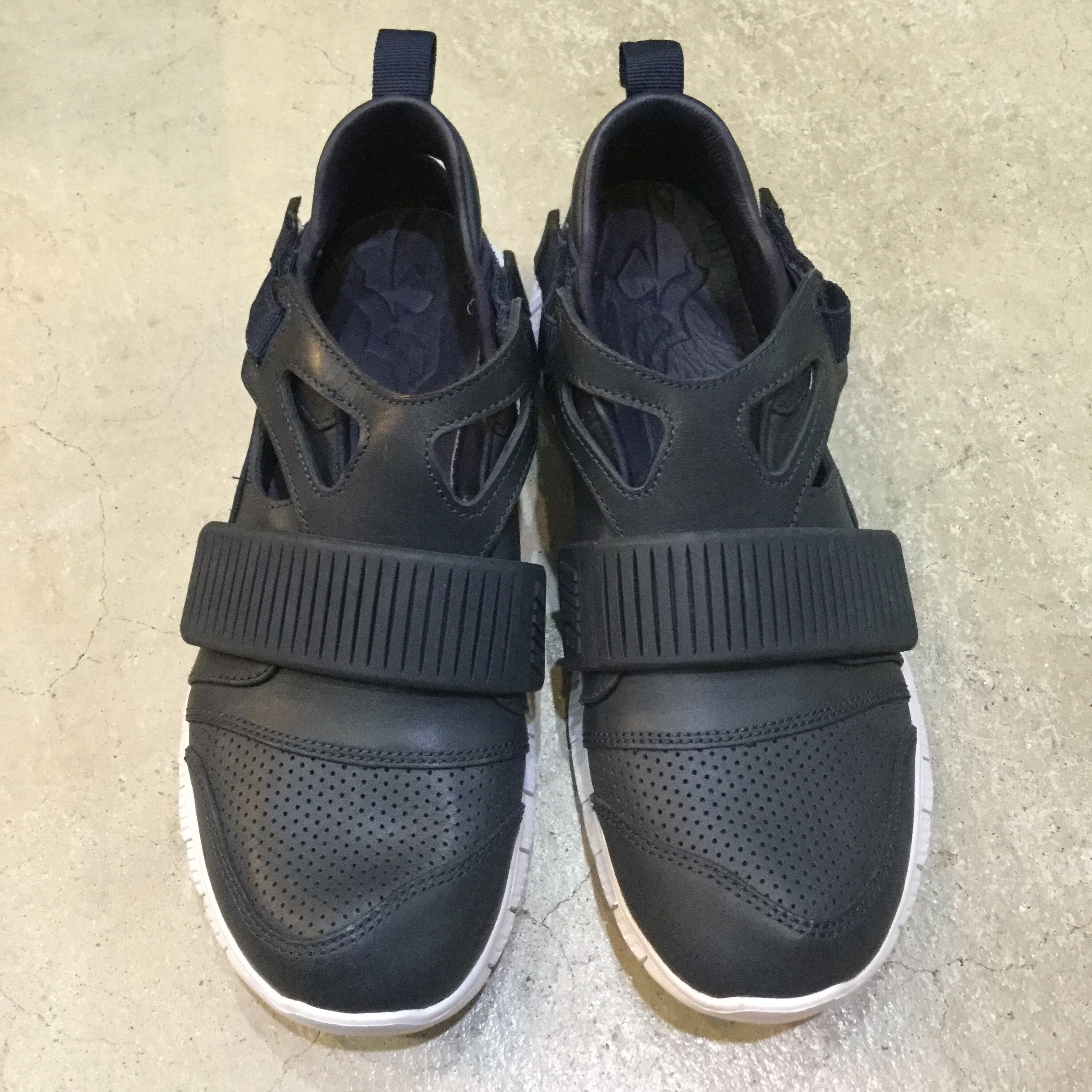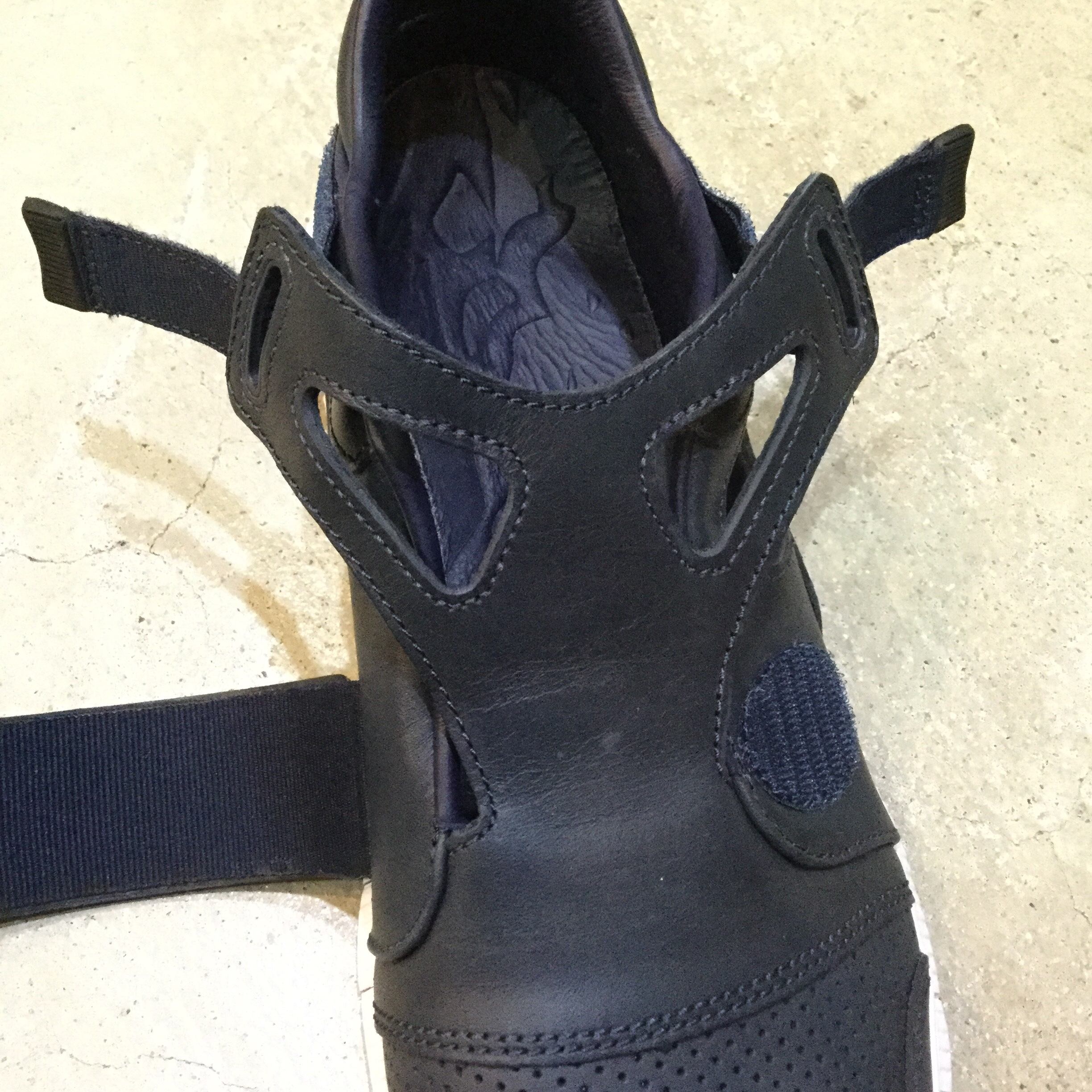 クロスベルトストラップ、ラバーの甲のベルトで調節するデザインで、ネイビーカラーの大人な一足!