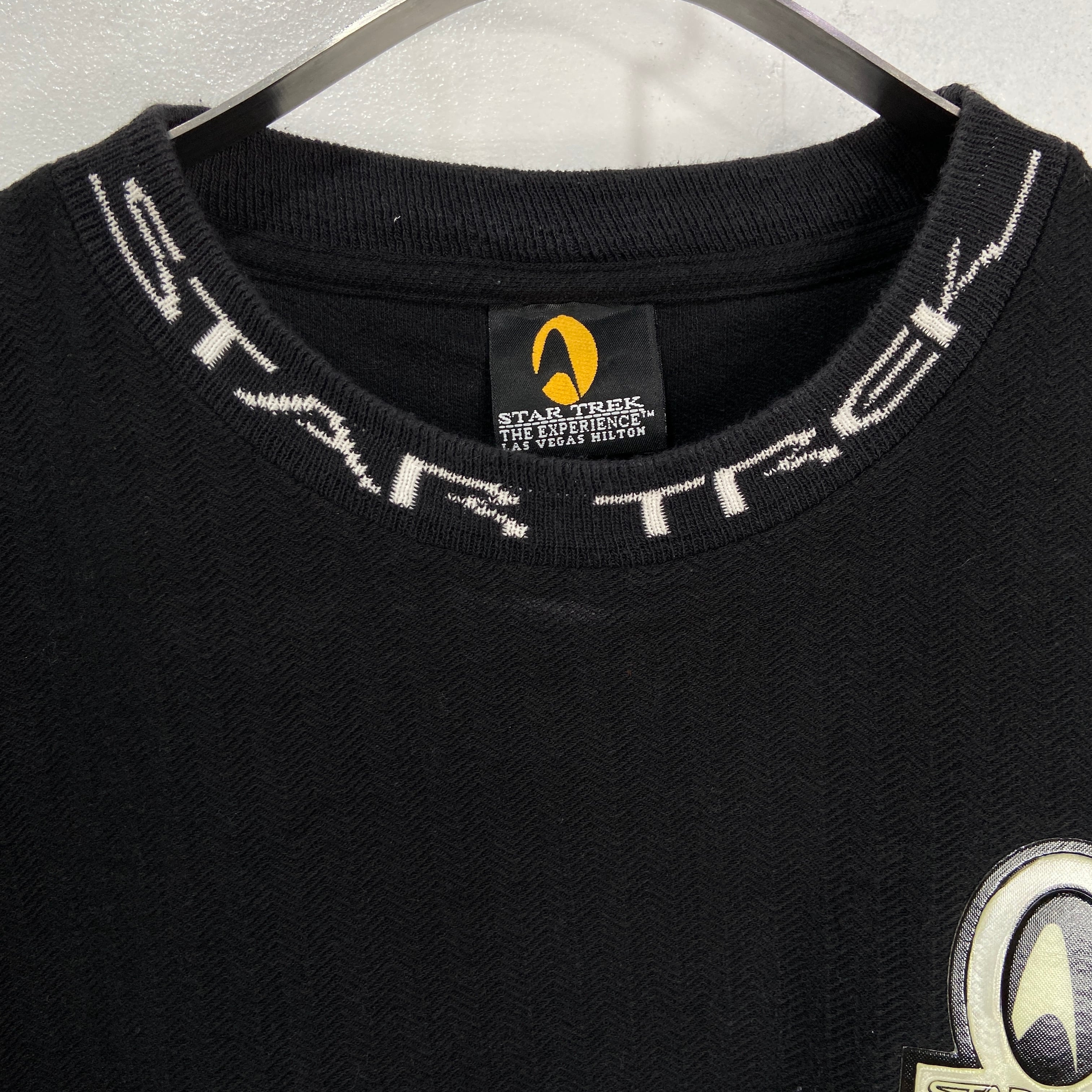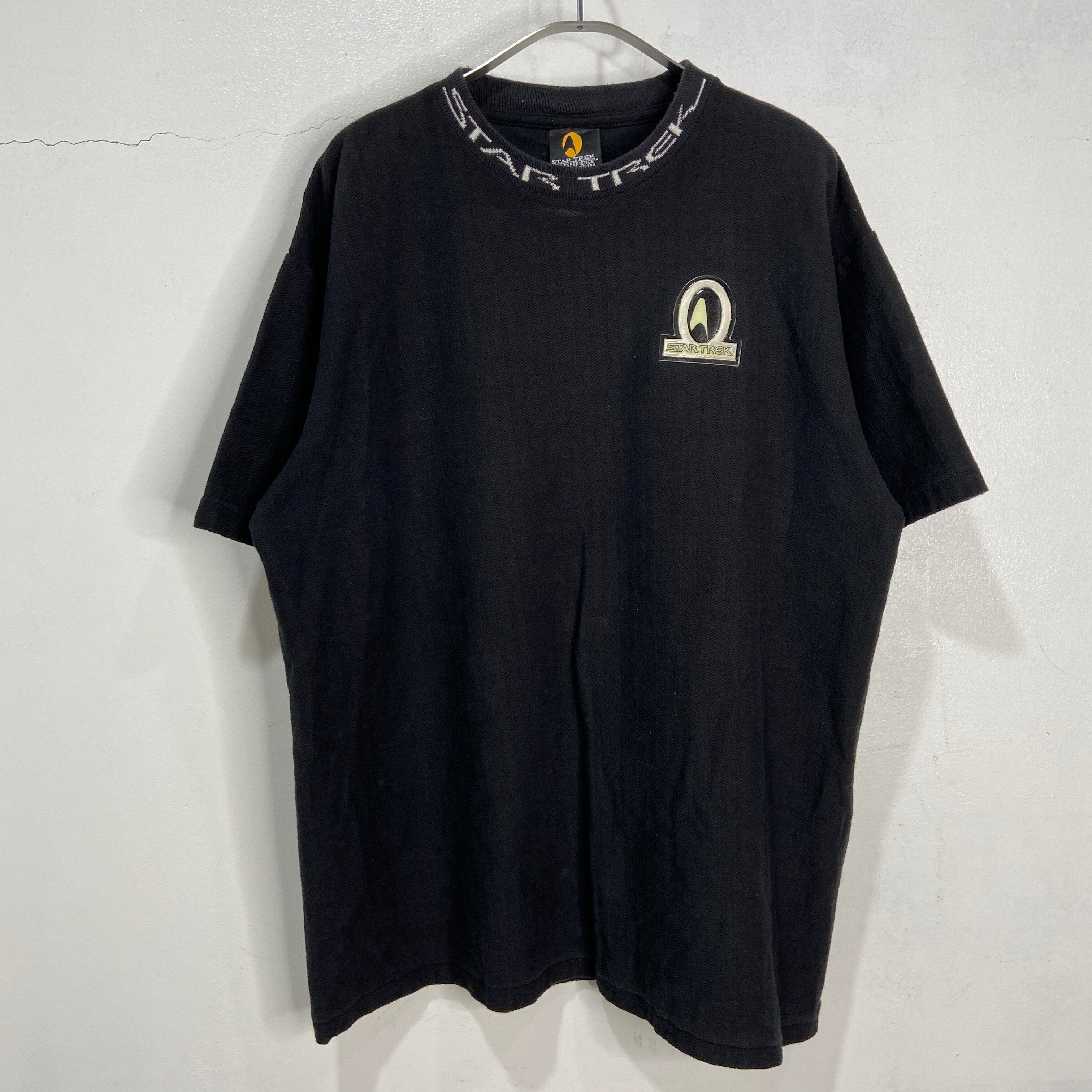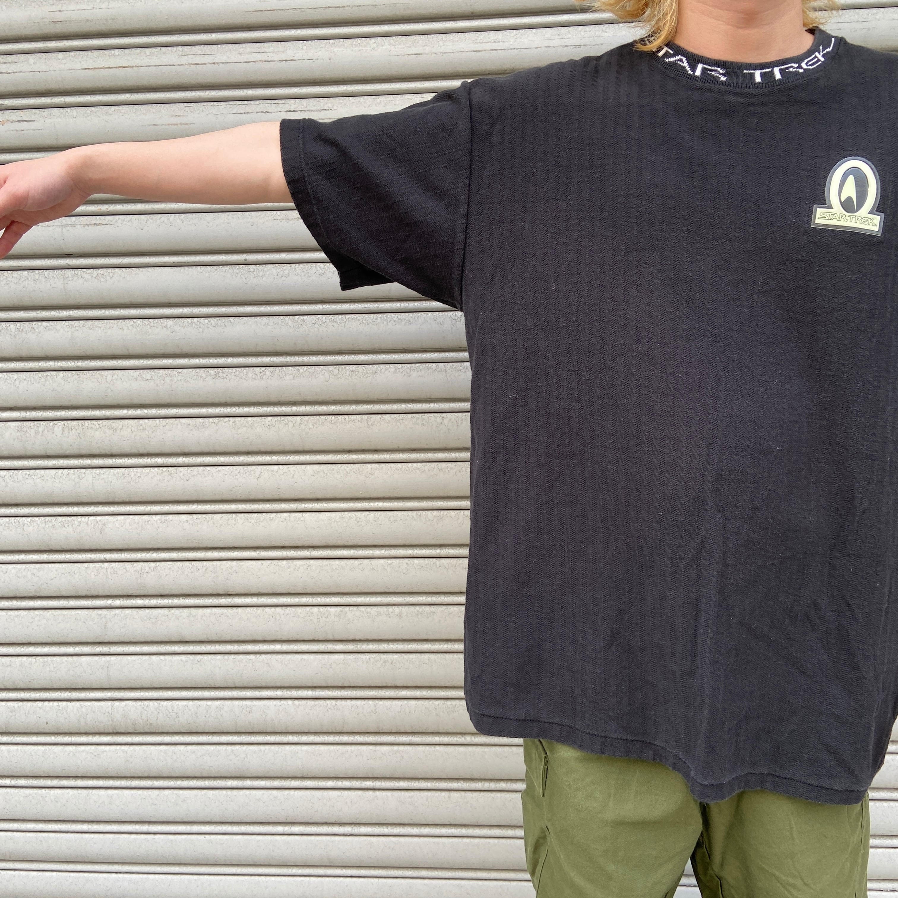 こちらのTシャツは珍しい、首元にスタートレックの文字、胸には反射板の様な素材でつくられたロゴが貼られたデザインになっております!
