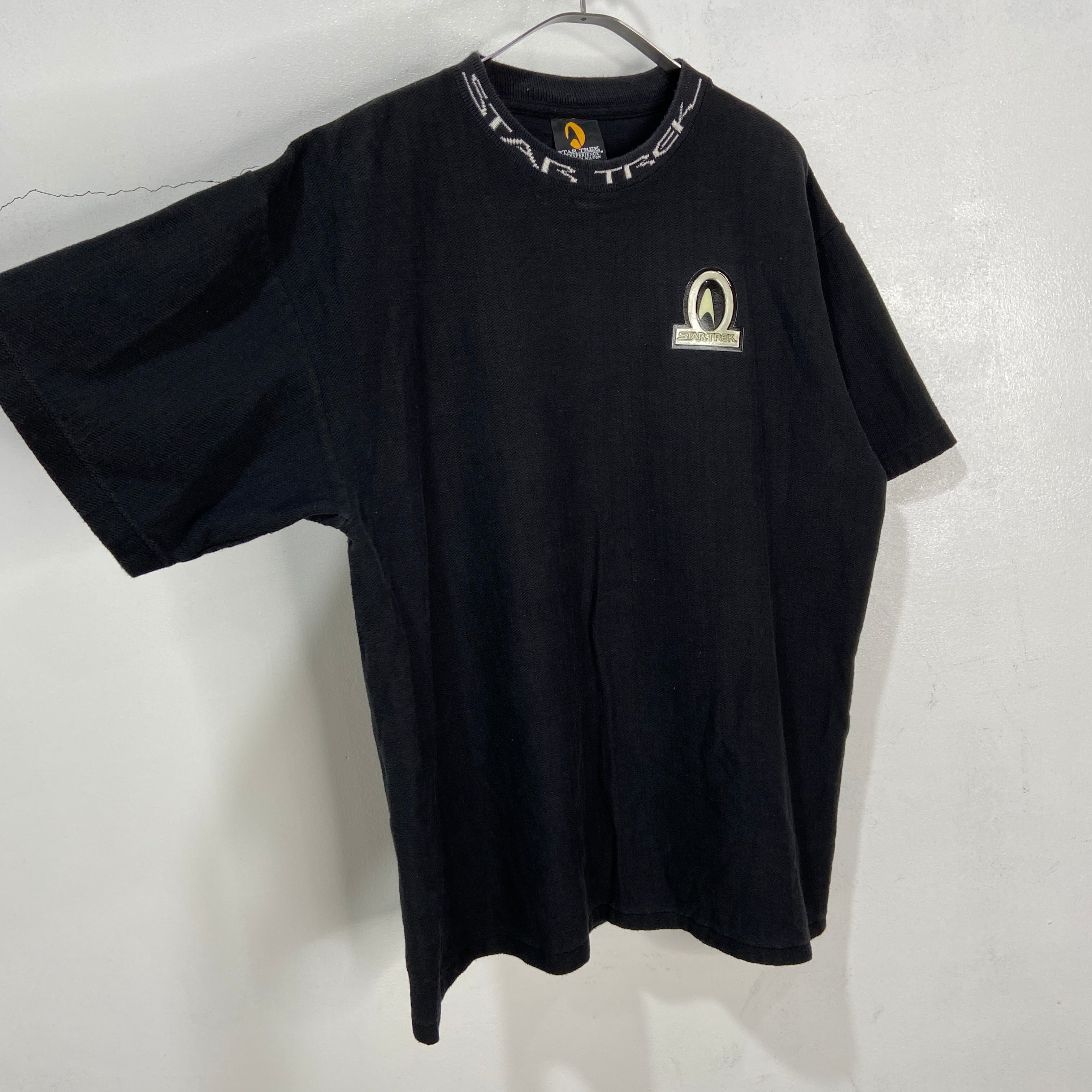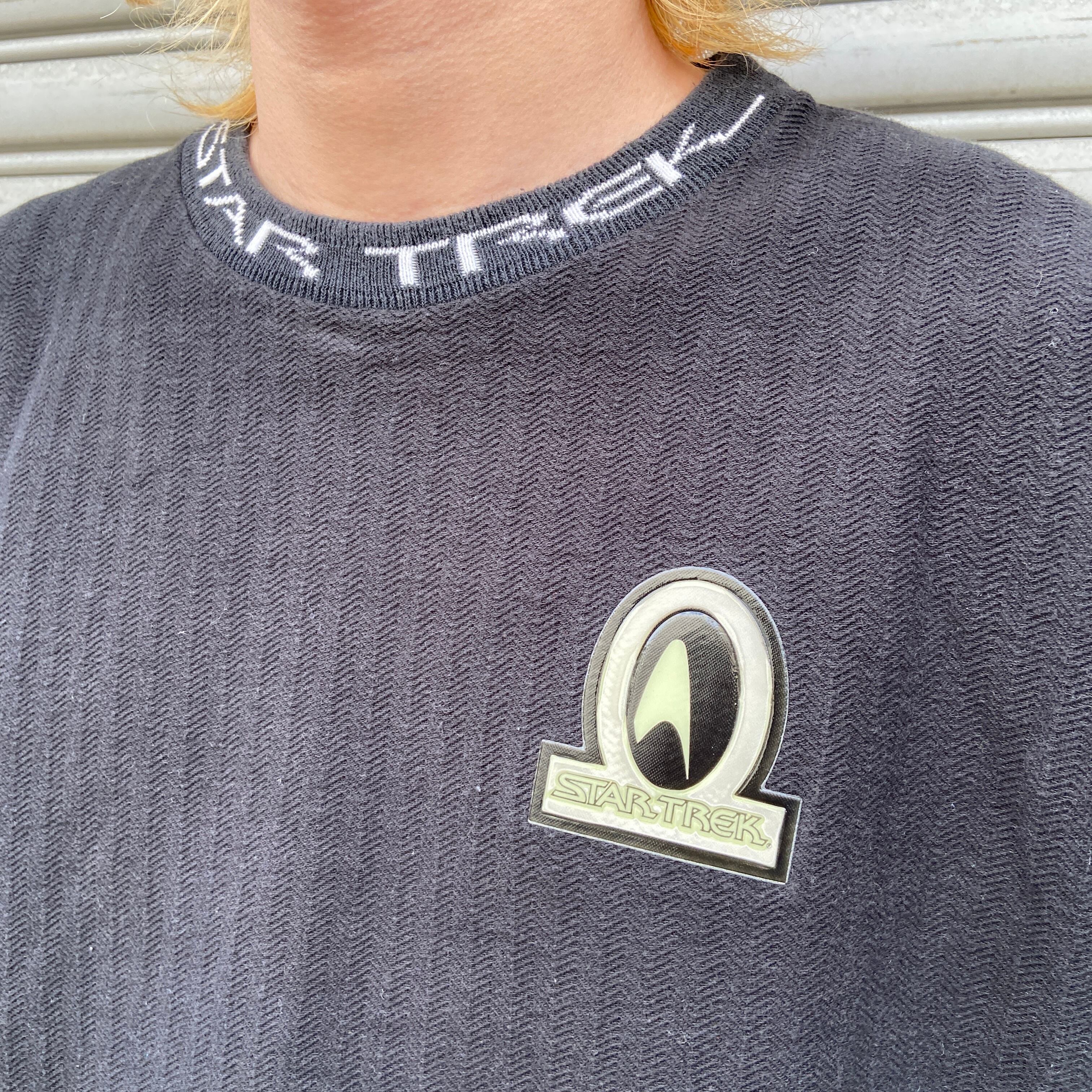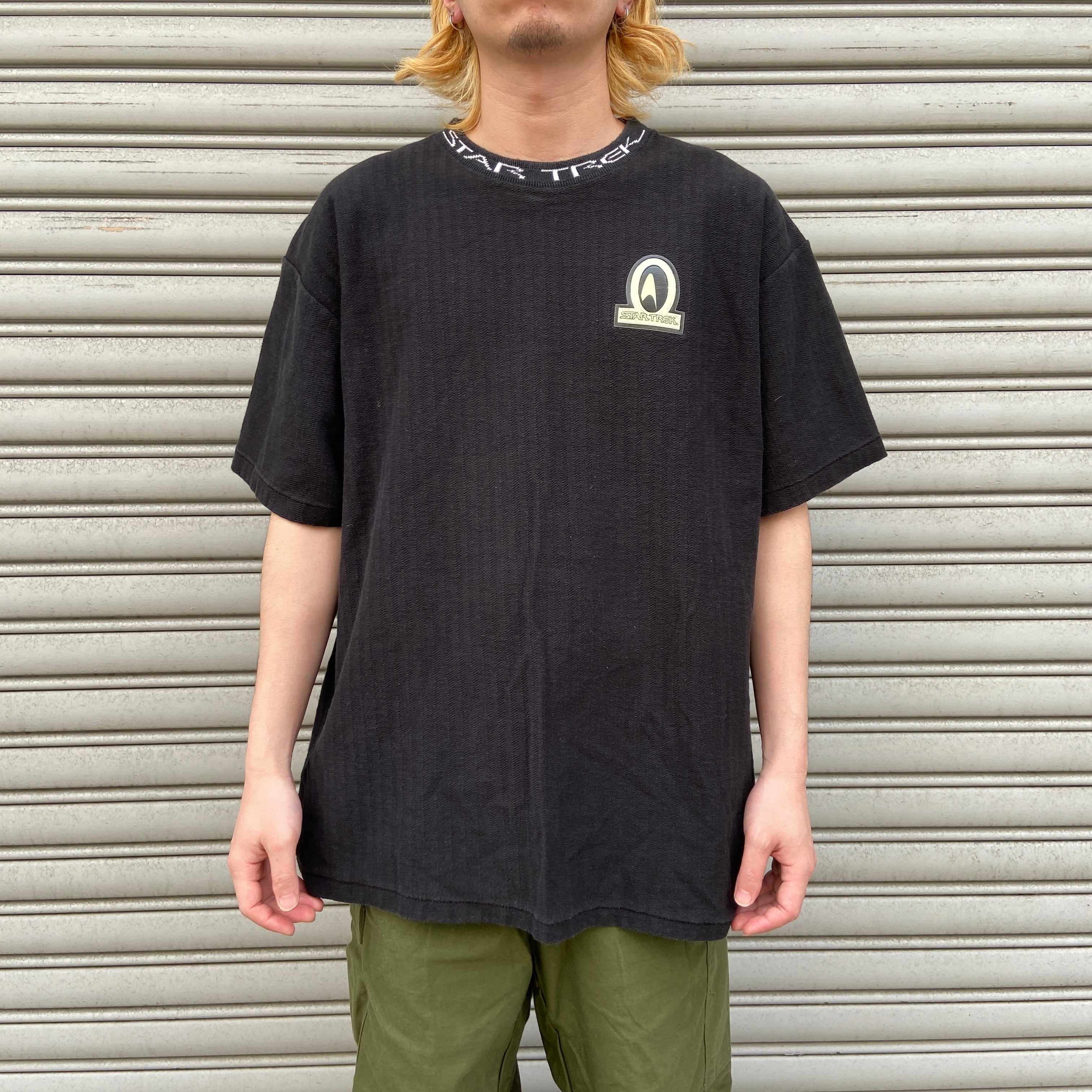 こちらのTシャツは珍しい、首元にスタートレックの文字、胸には反射板の様な素材でつくられたロゴが貼られたデザインになっております!