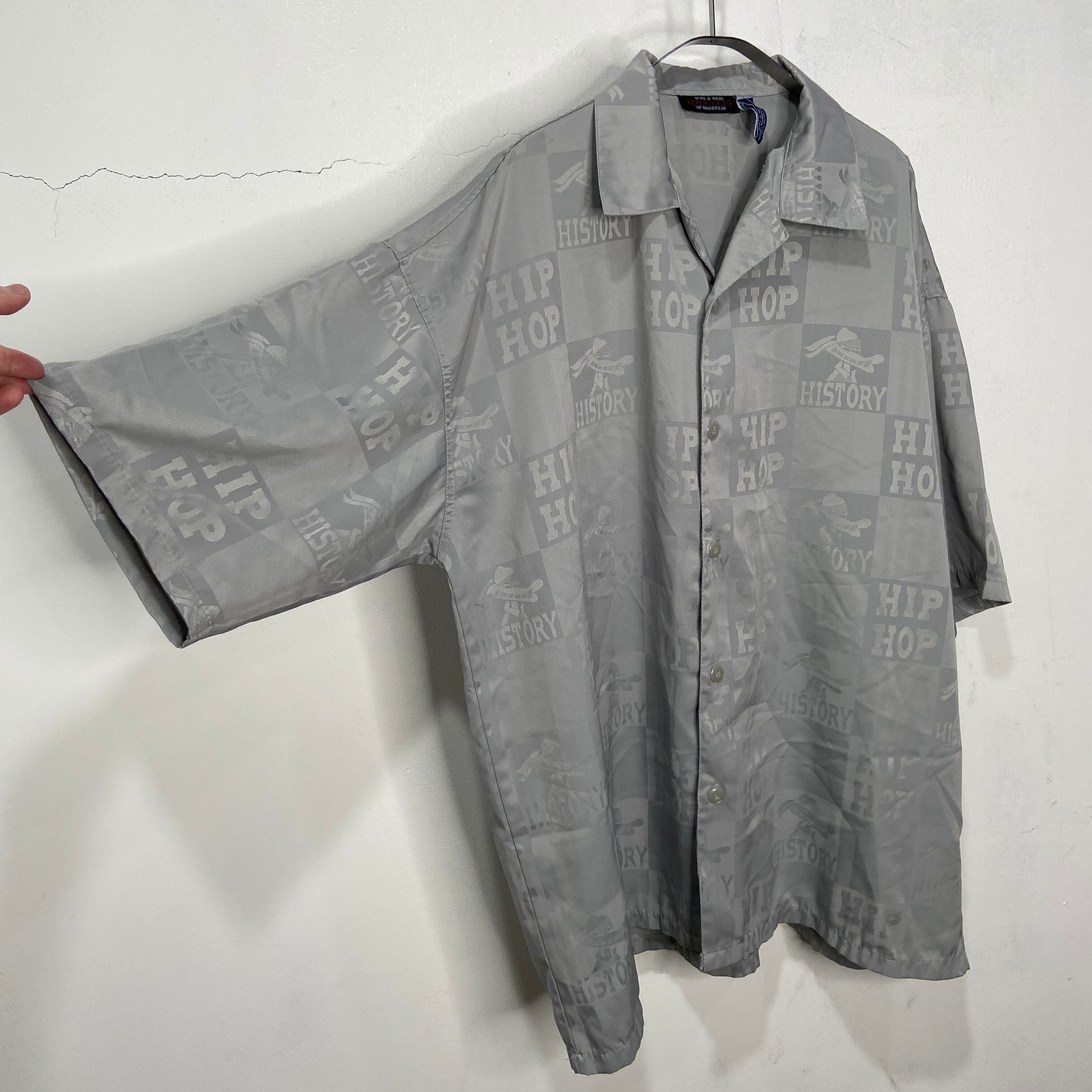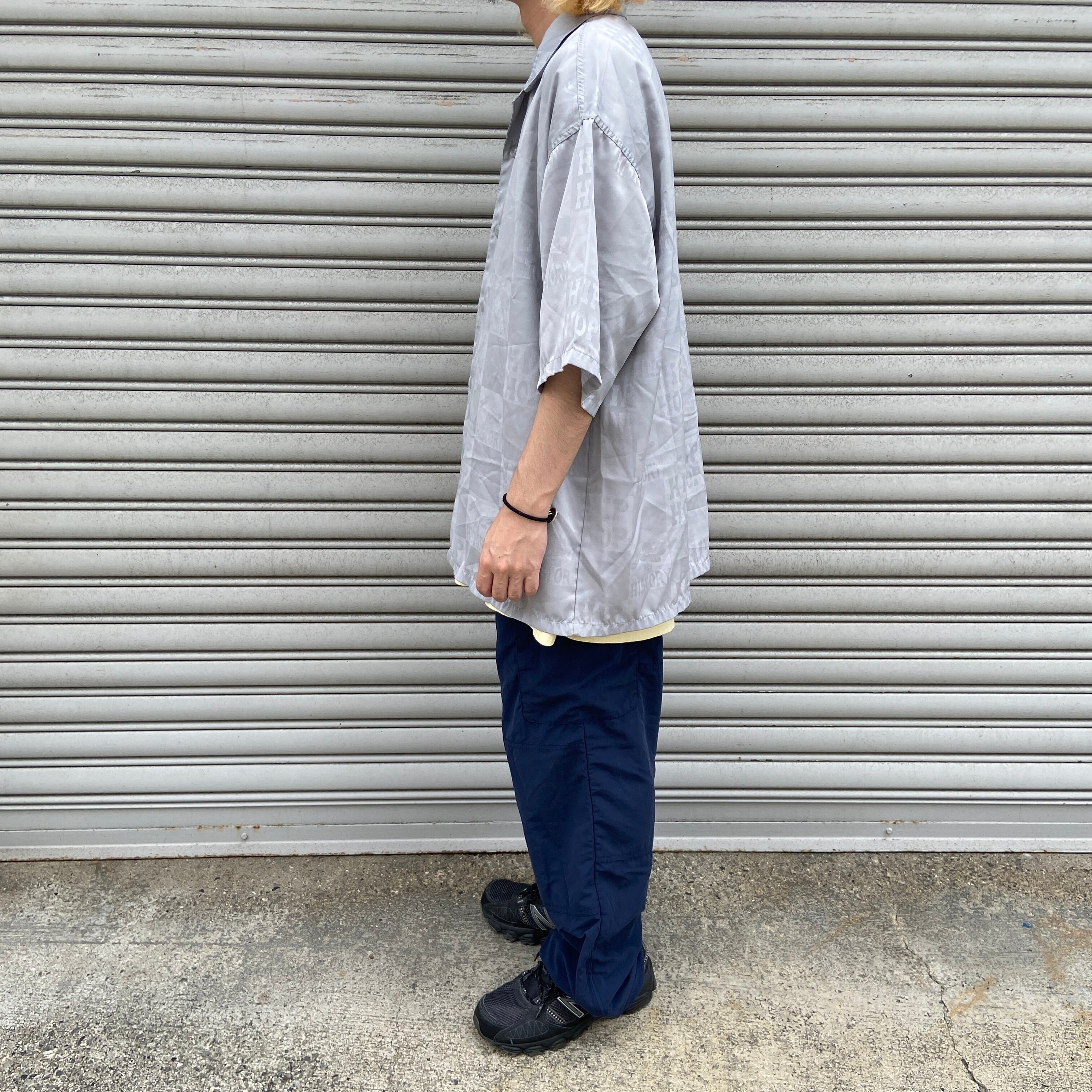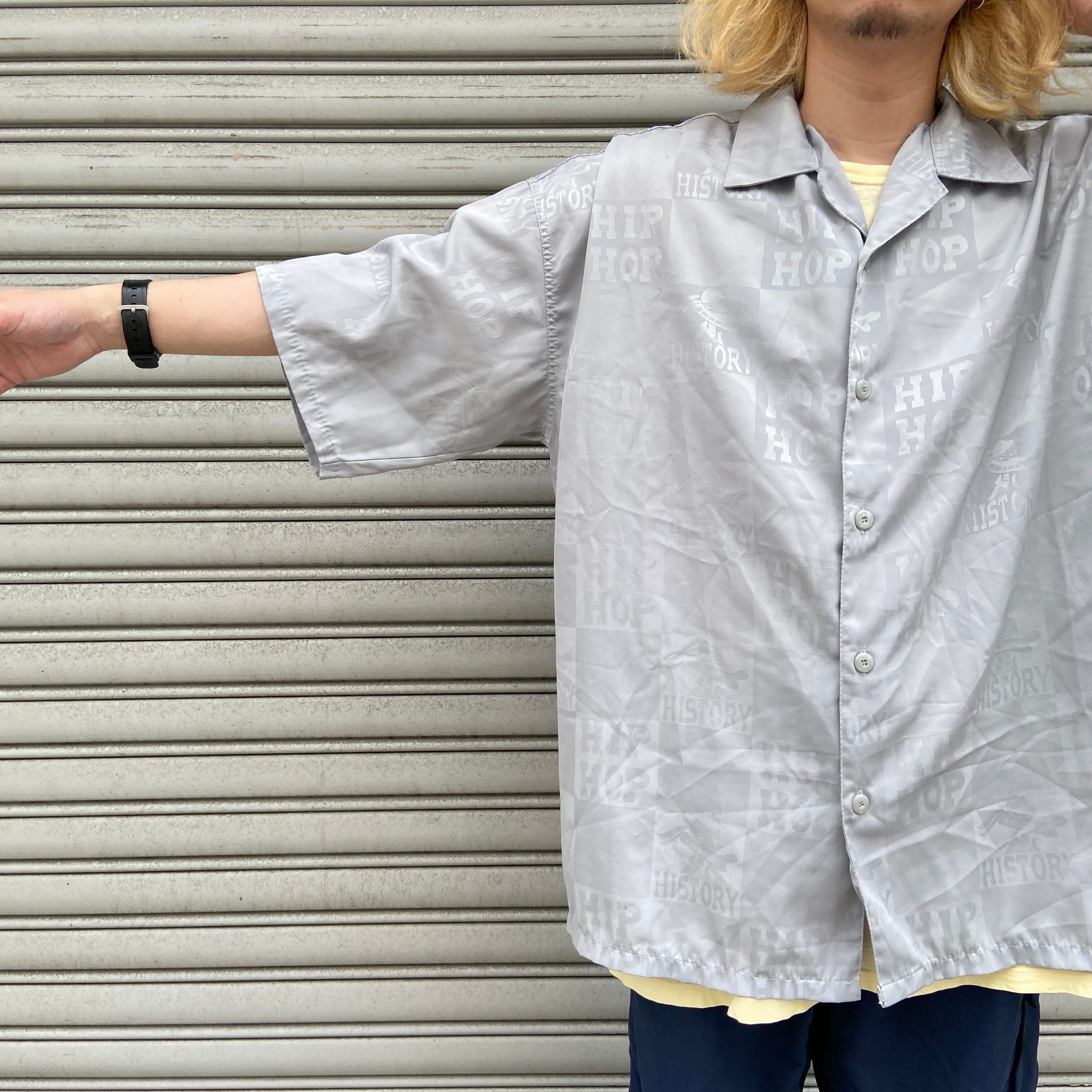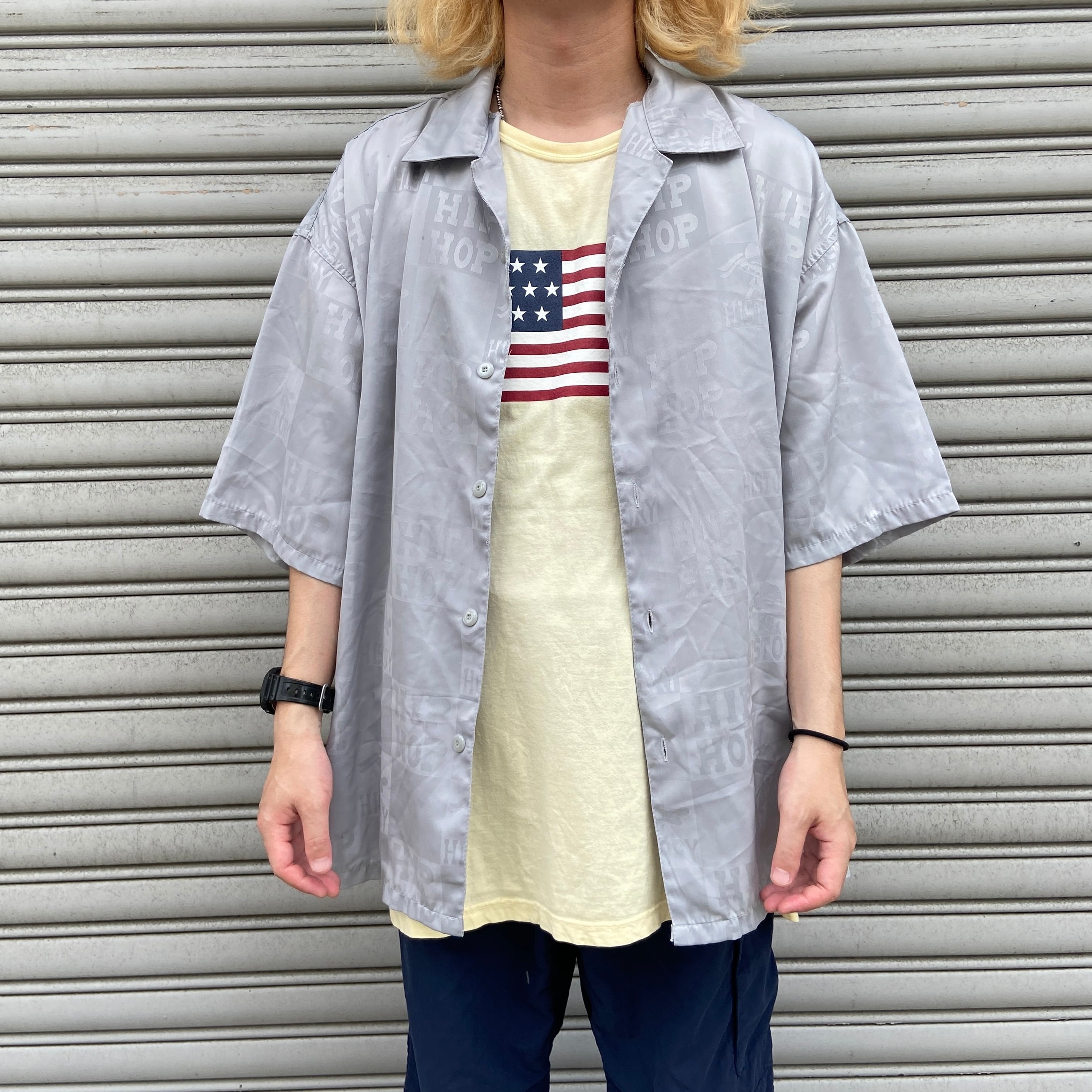 光沢のあるグレーカラーにモノグラム調のロゴが総柄デザインのオープンカラーシャツです!