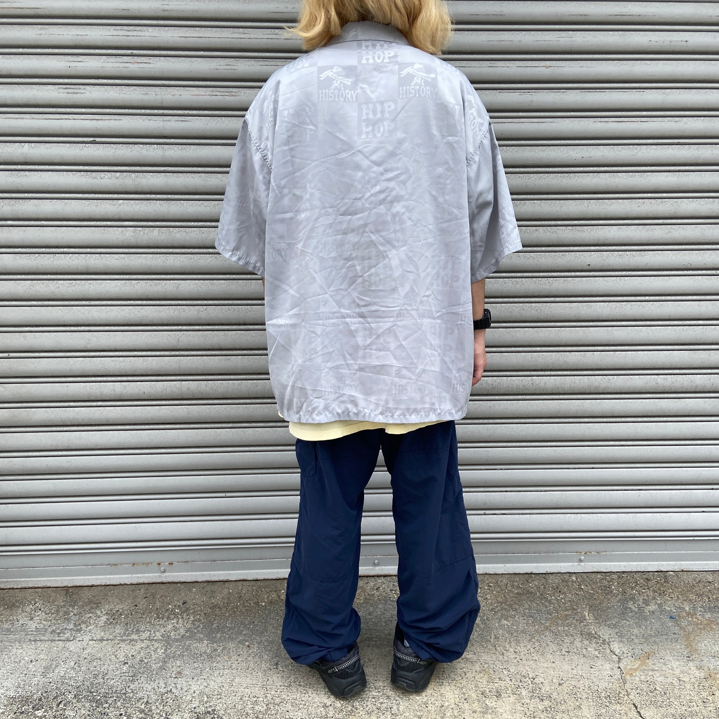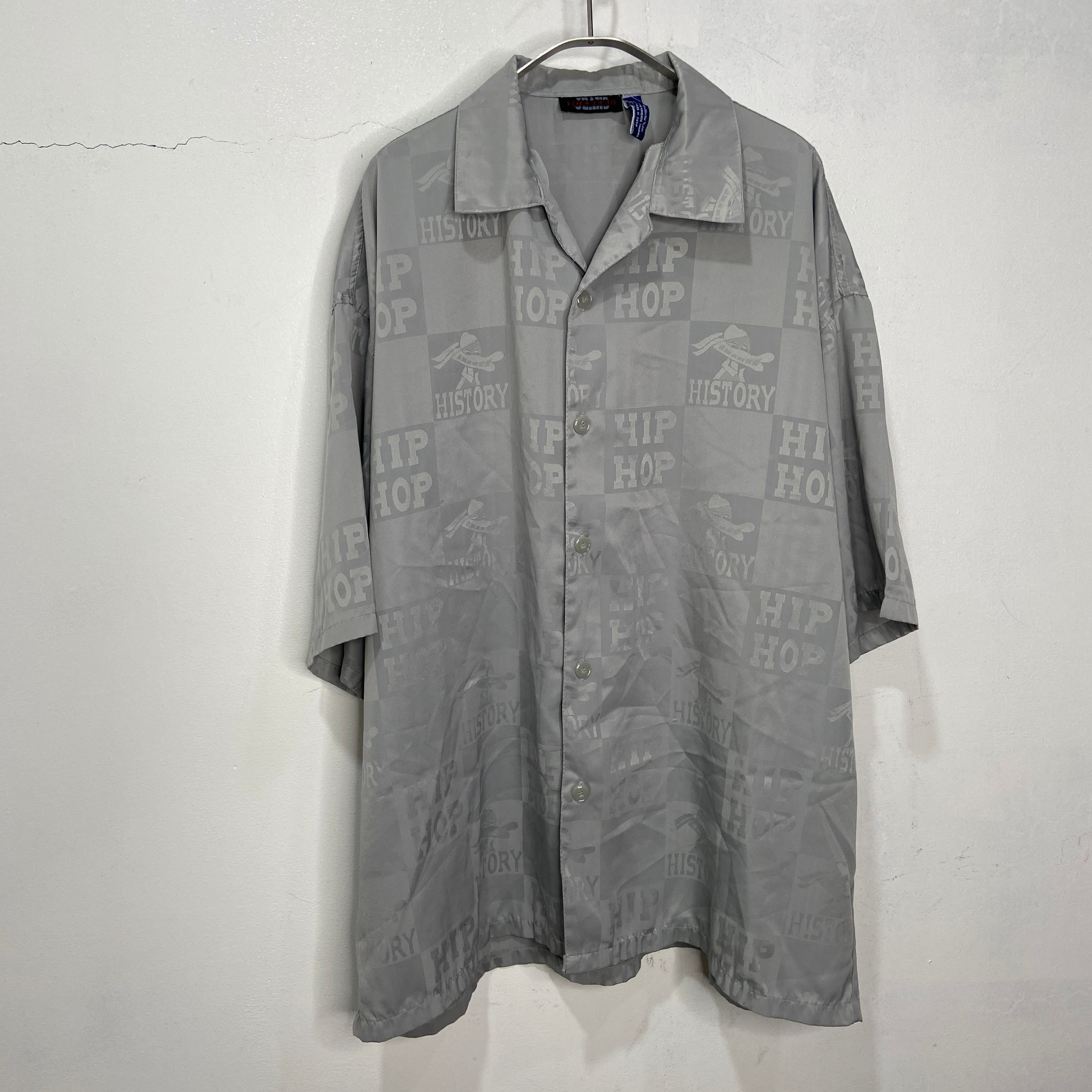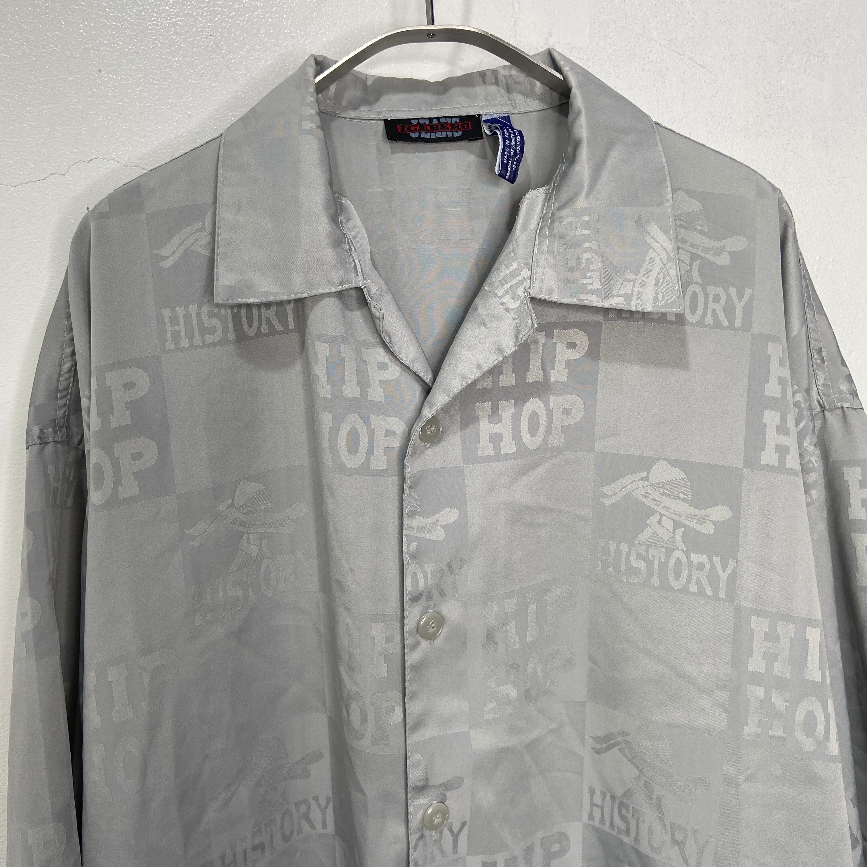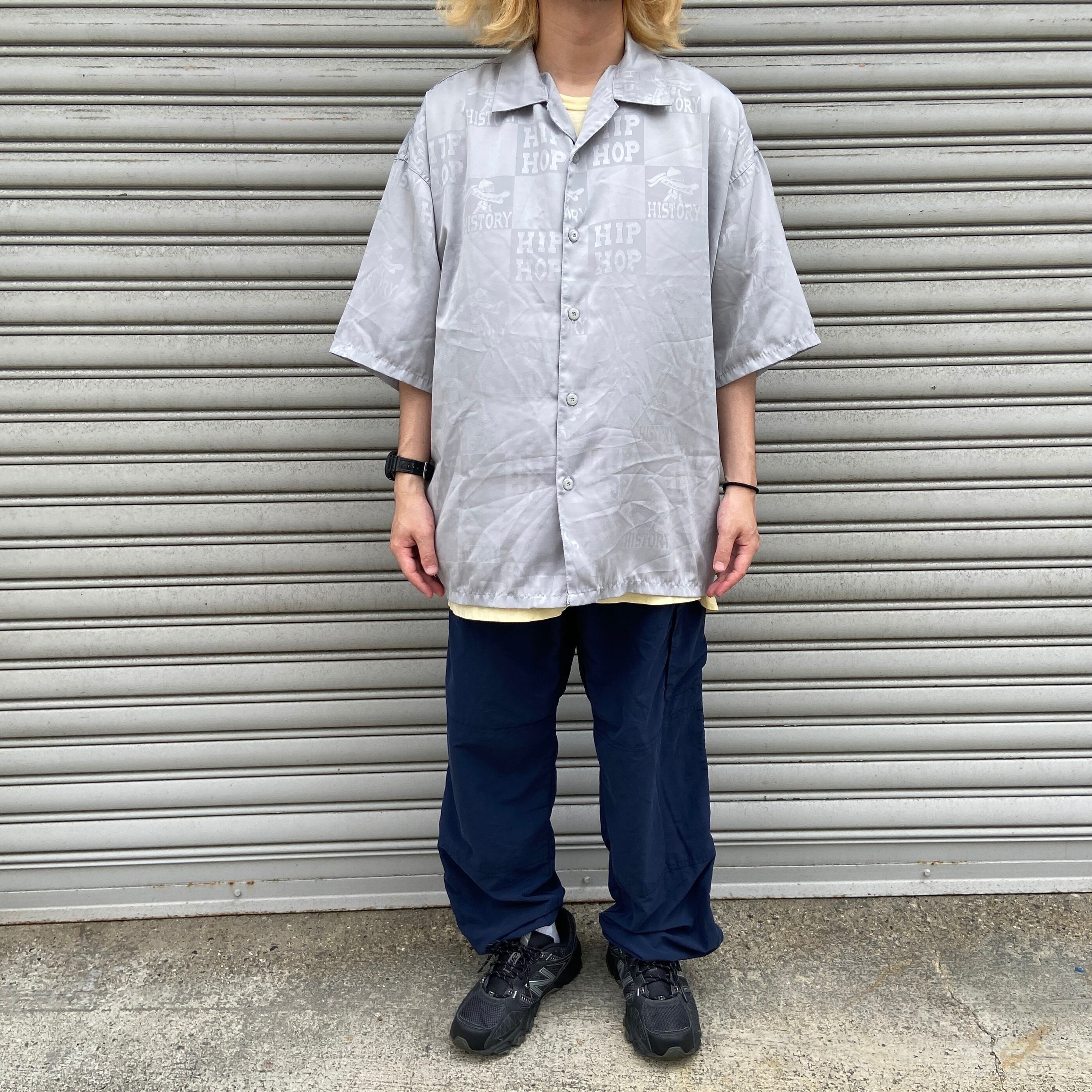 光沢のあるグレーカラーにモノグラム調のロゴが総柄デザインのオープンカラーシャツです!