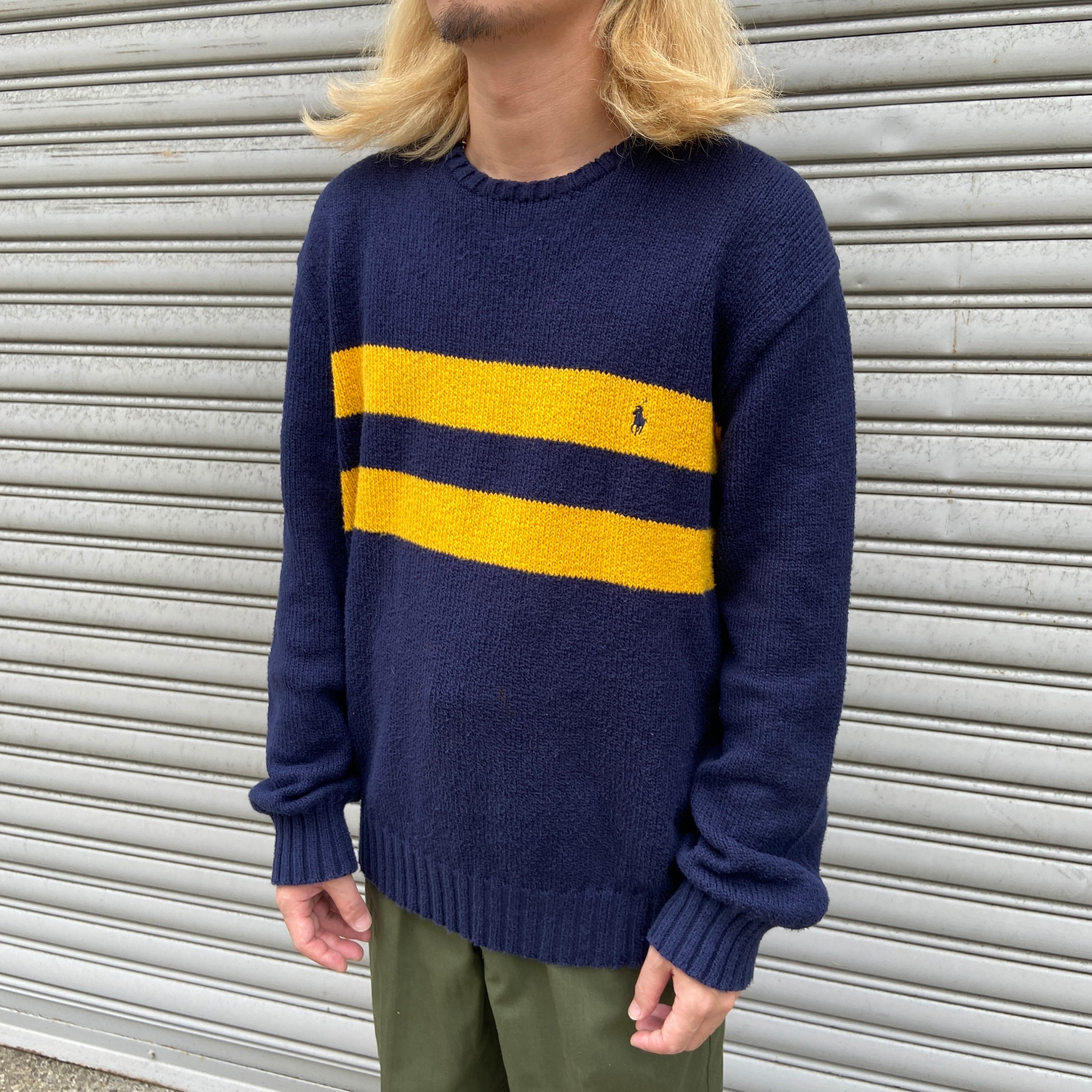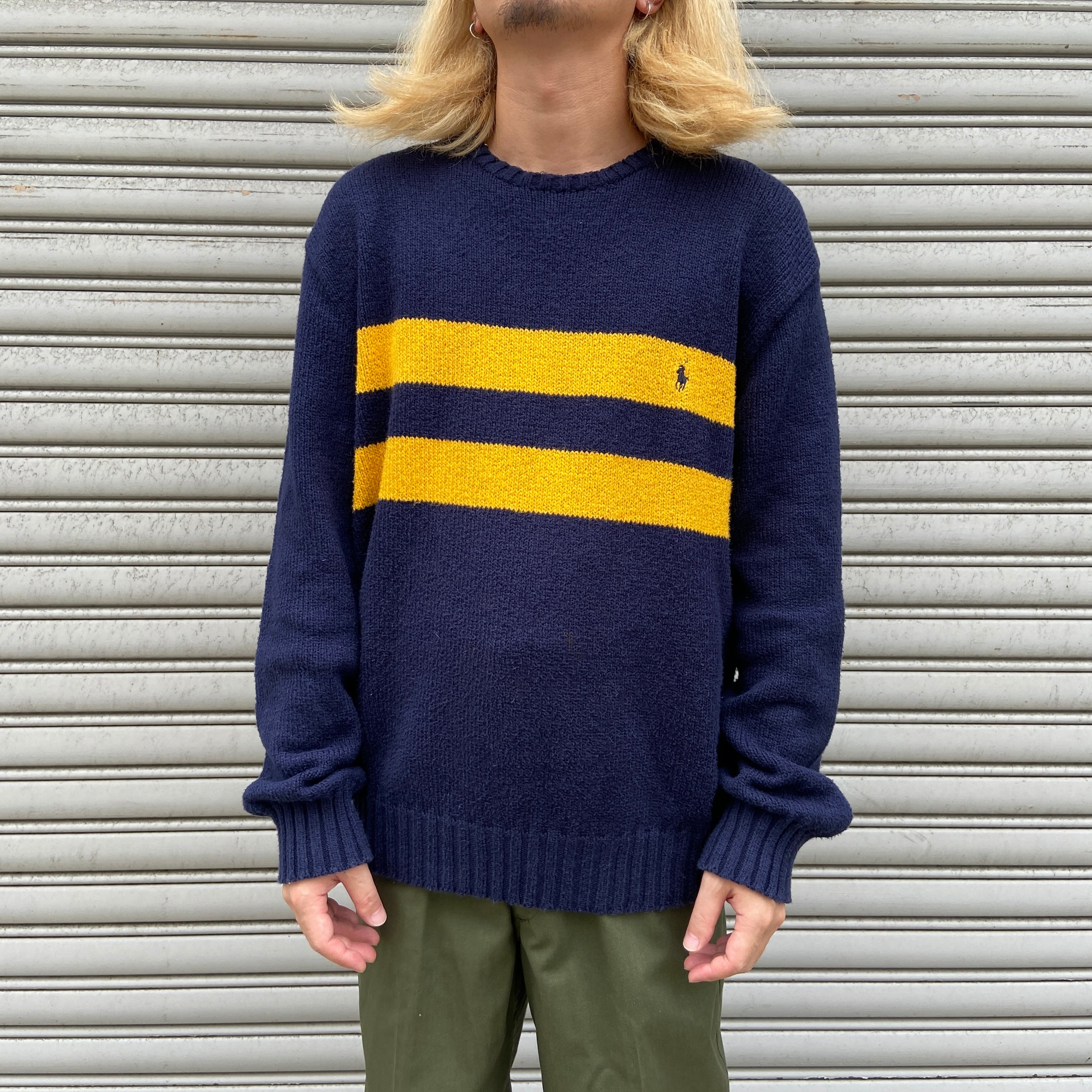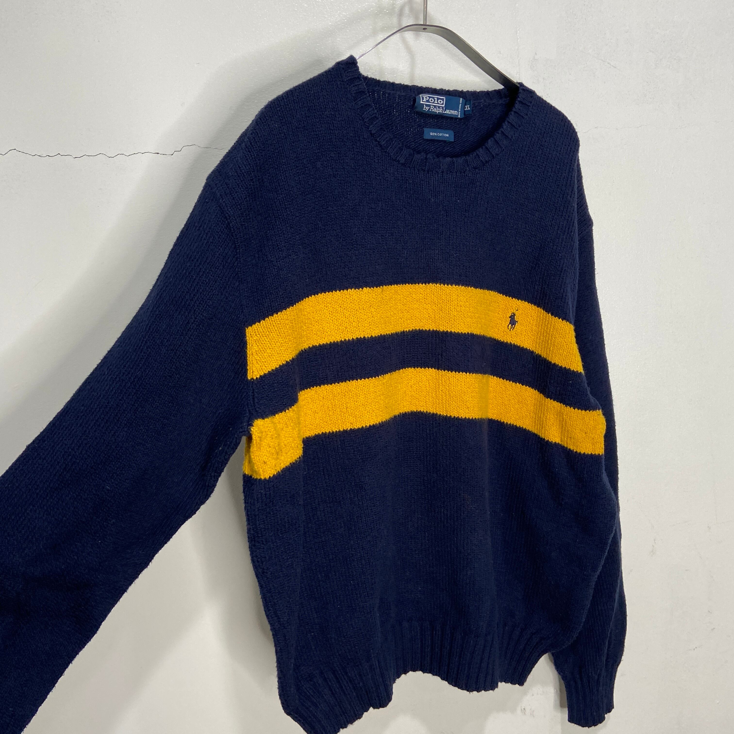 80s RalphLauren ボーダー柄コットンセーター ポニーロゴ 紺 XL