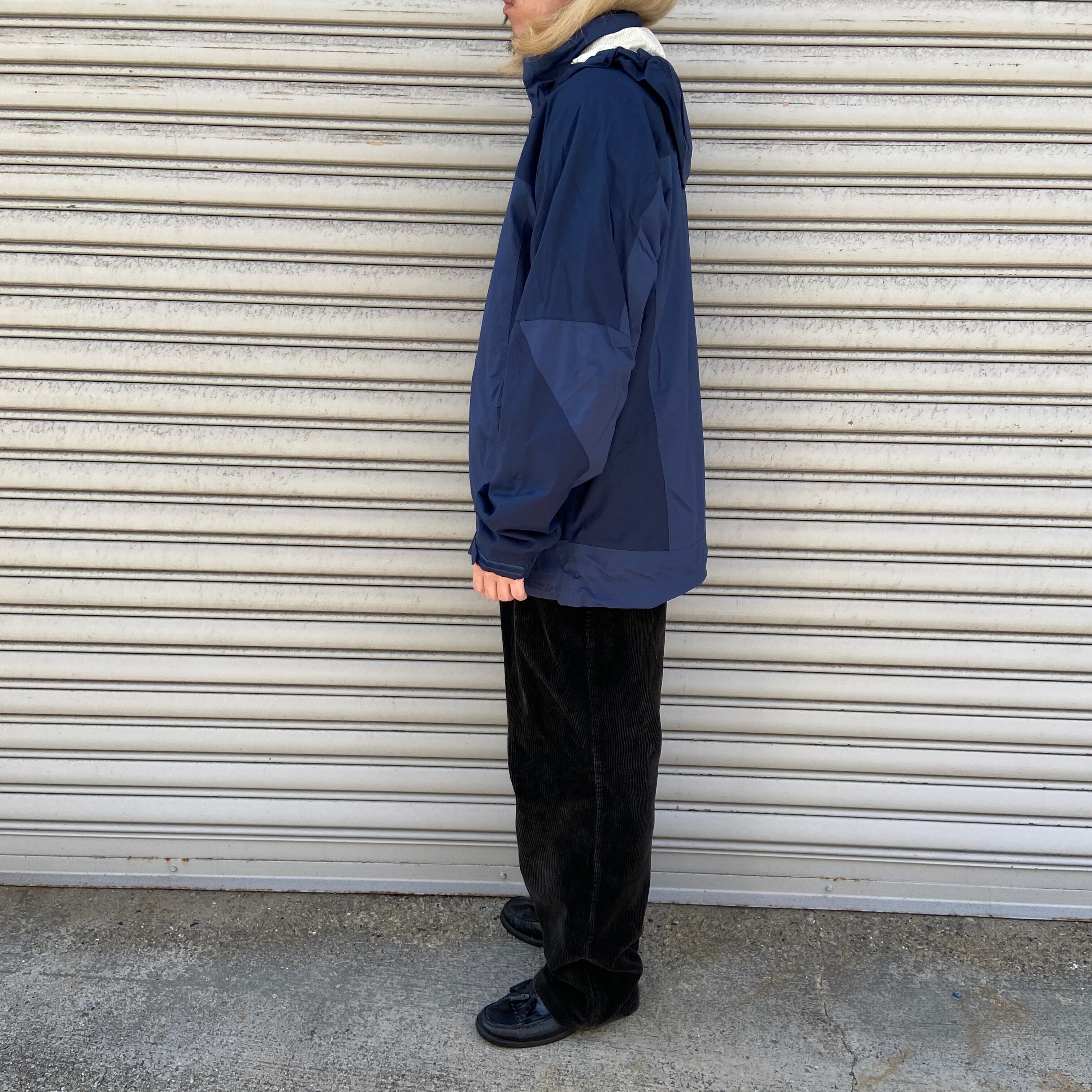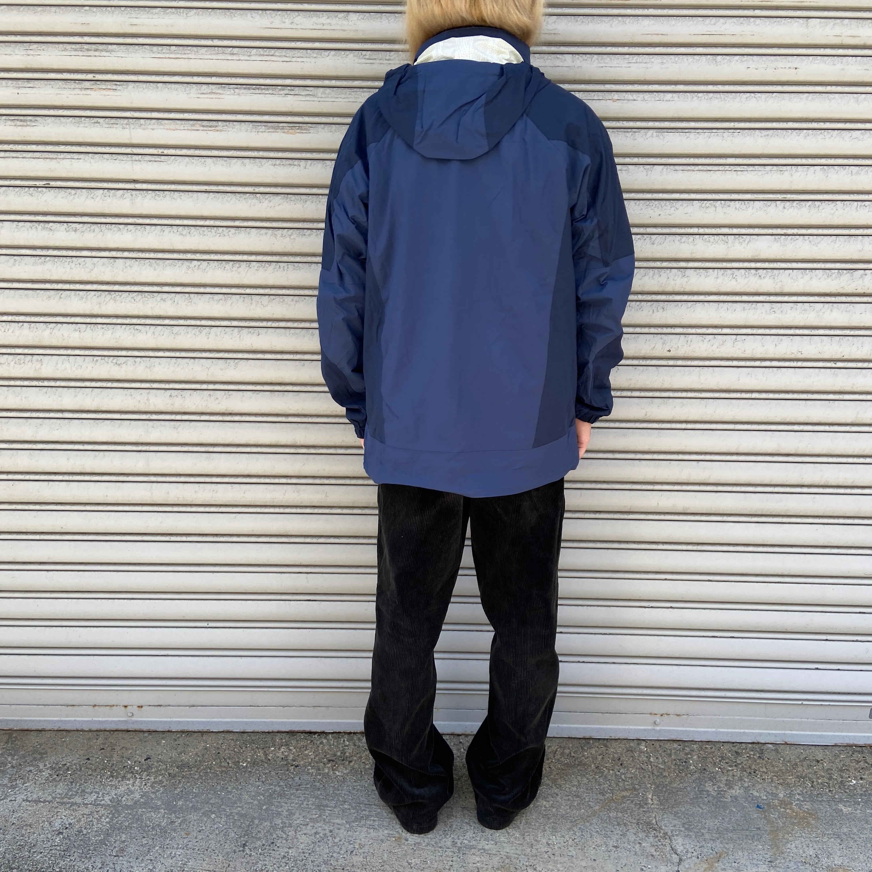 フードは襟には収納可能、裾にドローコード、袖先にマジックテープが装備されています。