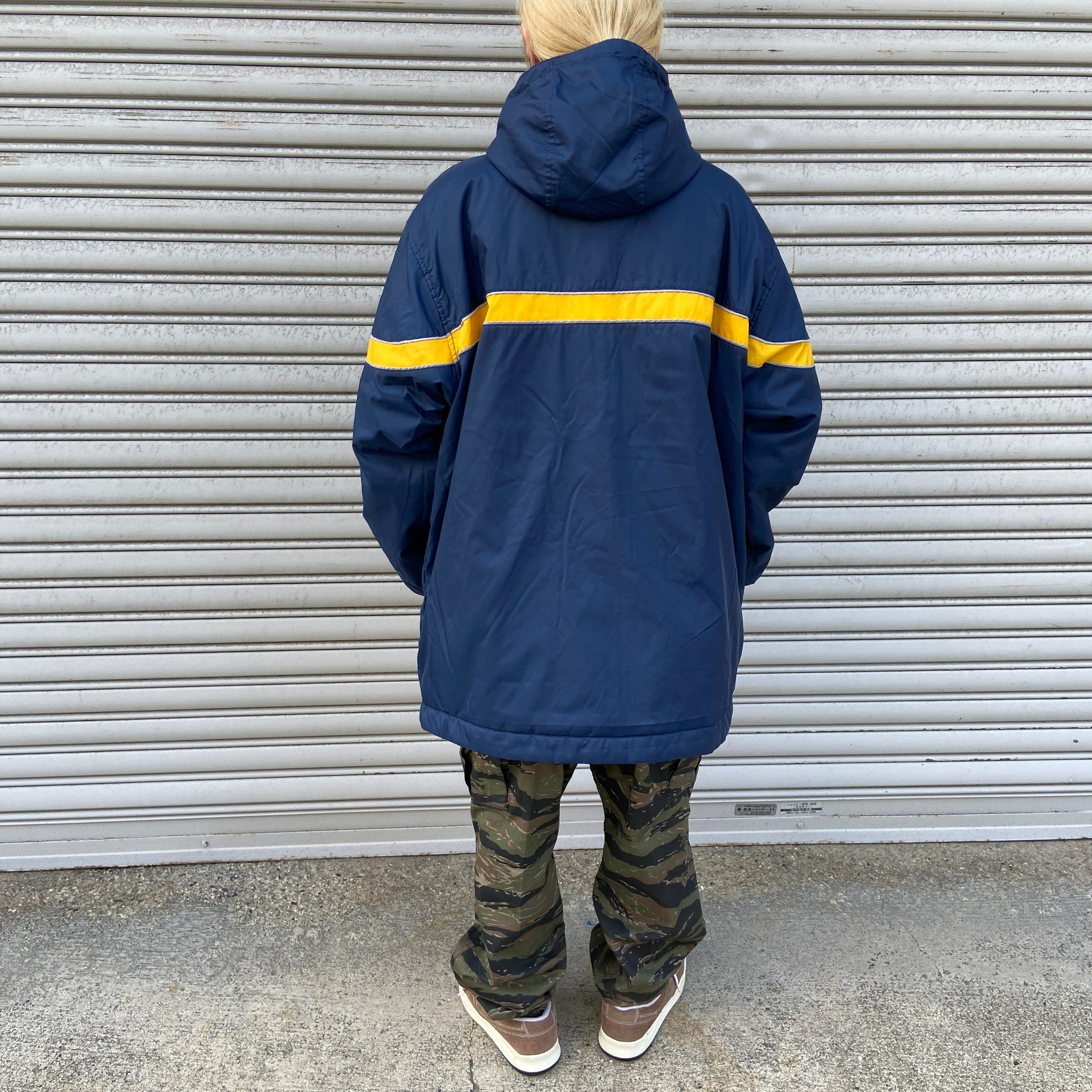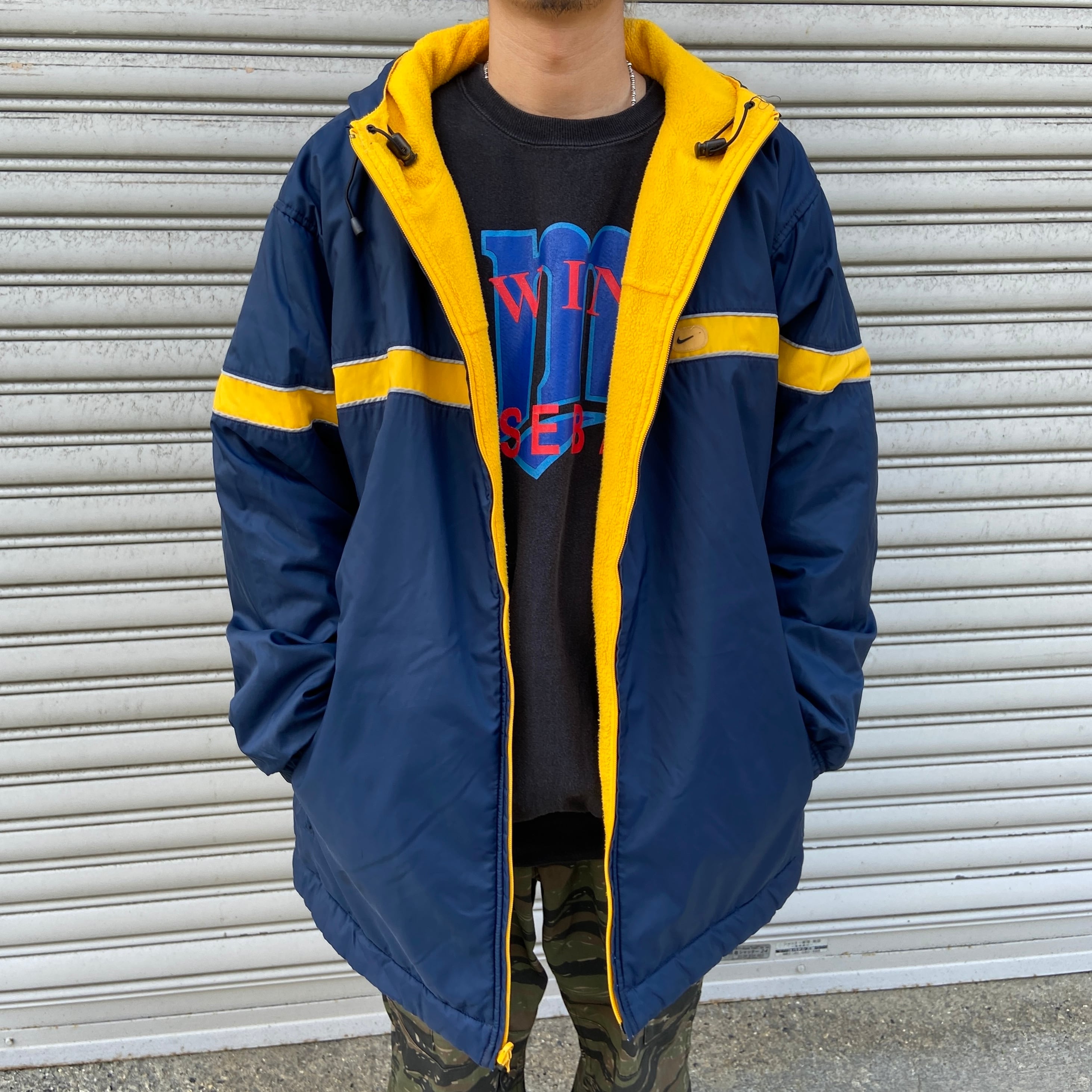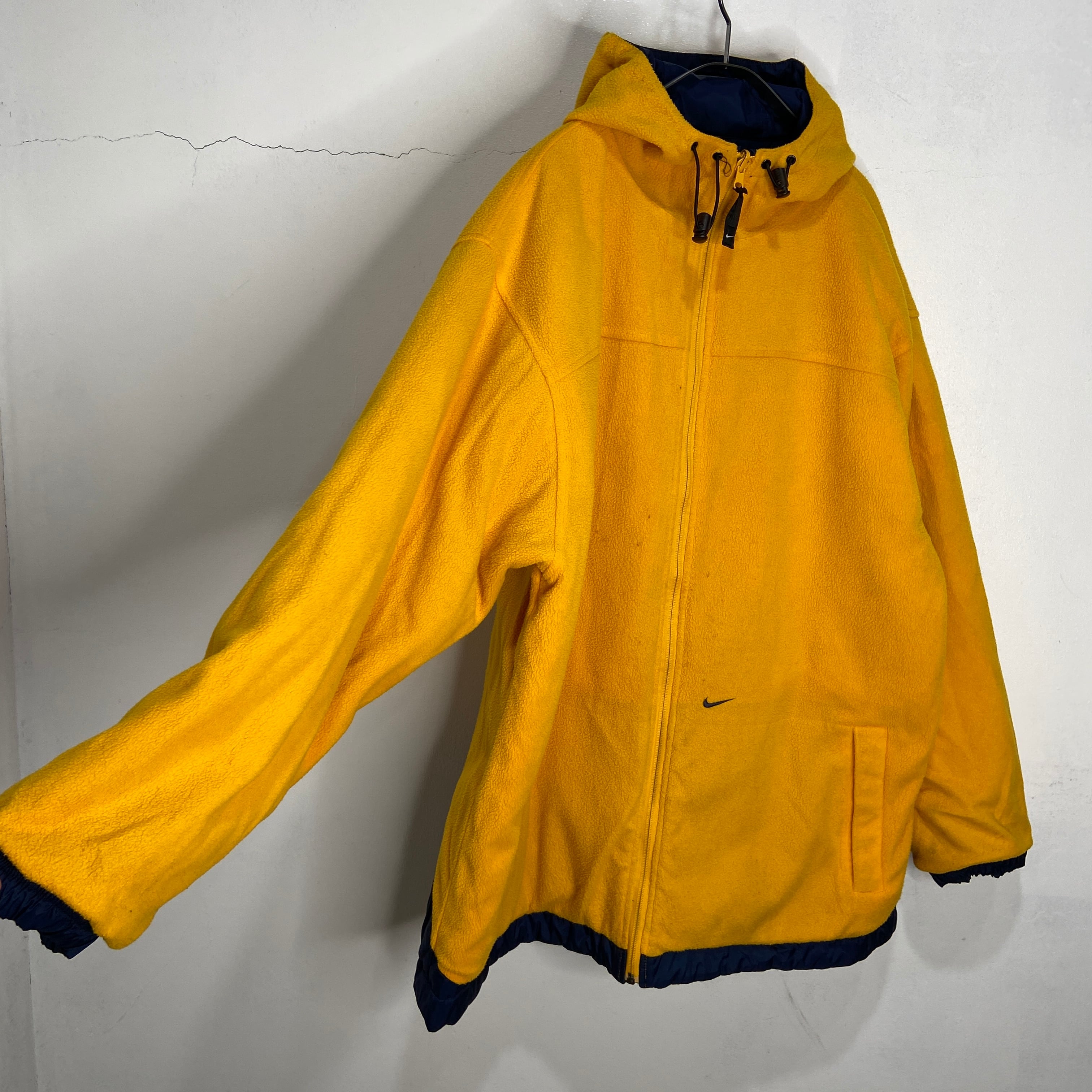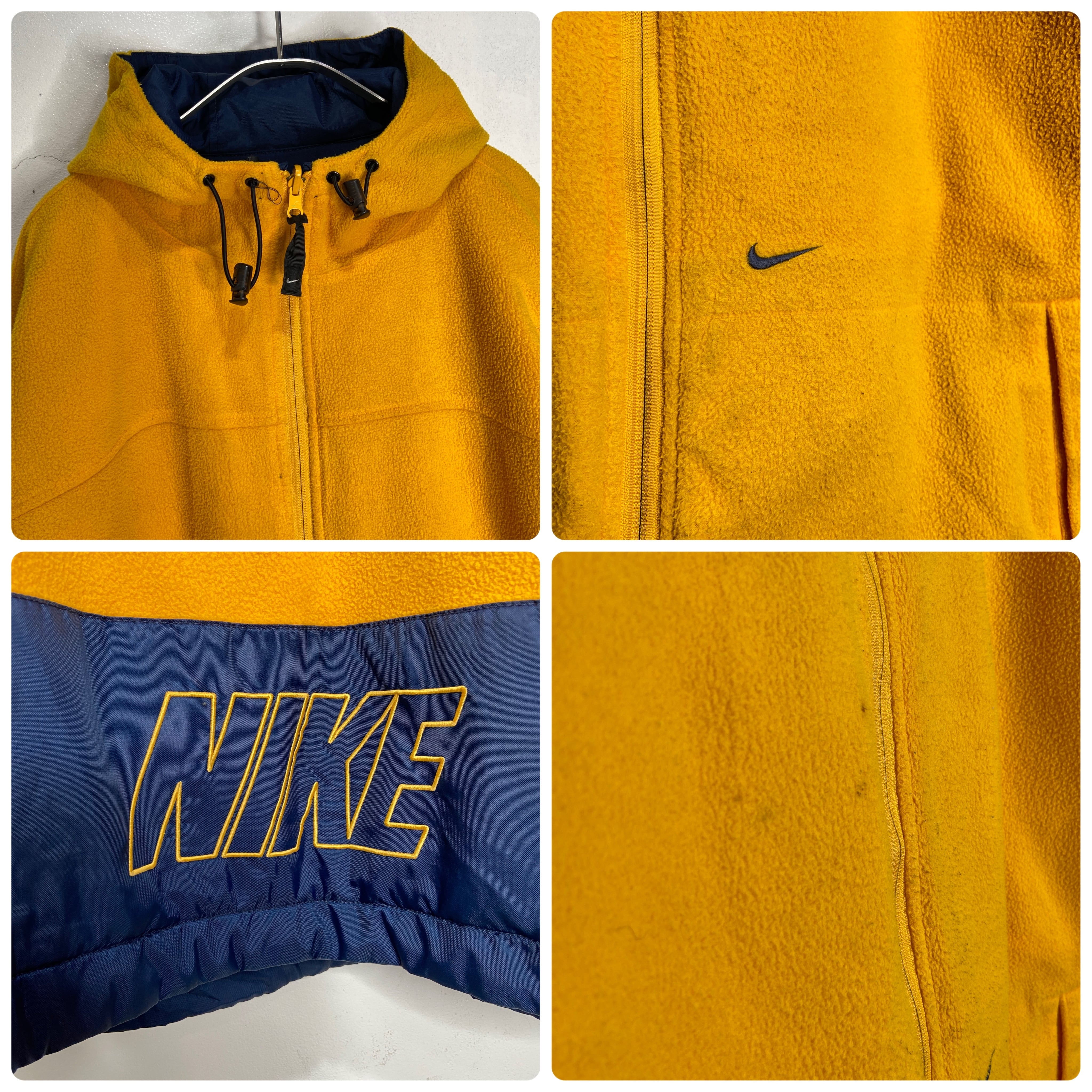 ネイビー面はハリのあるナイロン素材でセンターラインがアクセントに、イエローのフリース面はテール部分がナイロン切り替えのナイキロゴが大きく入って後ろ姿も抜かりなしなデザインです!