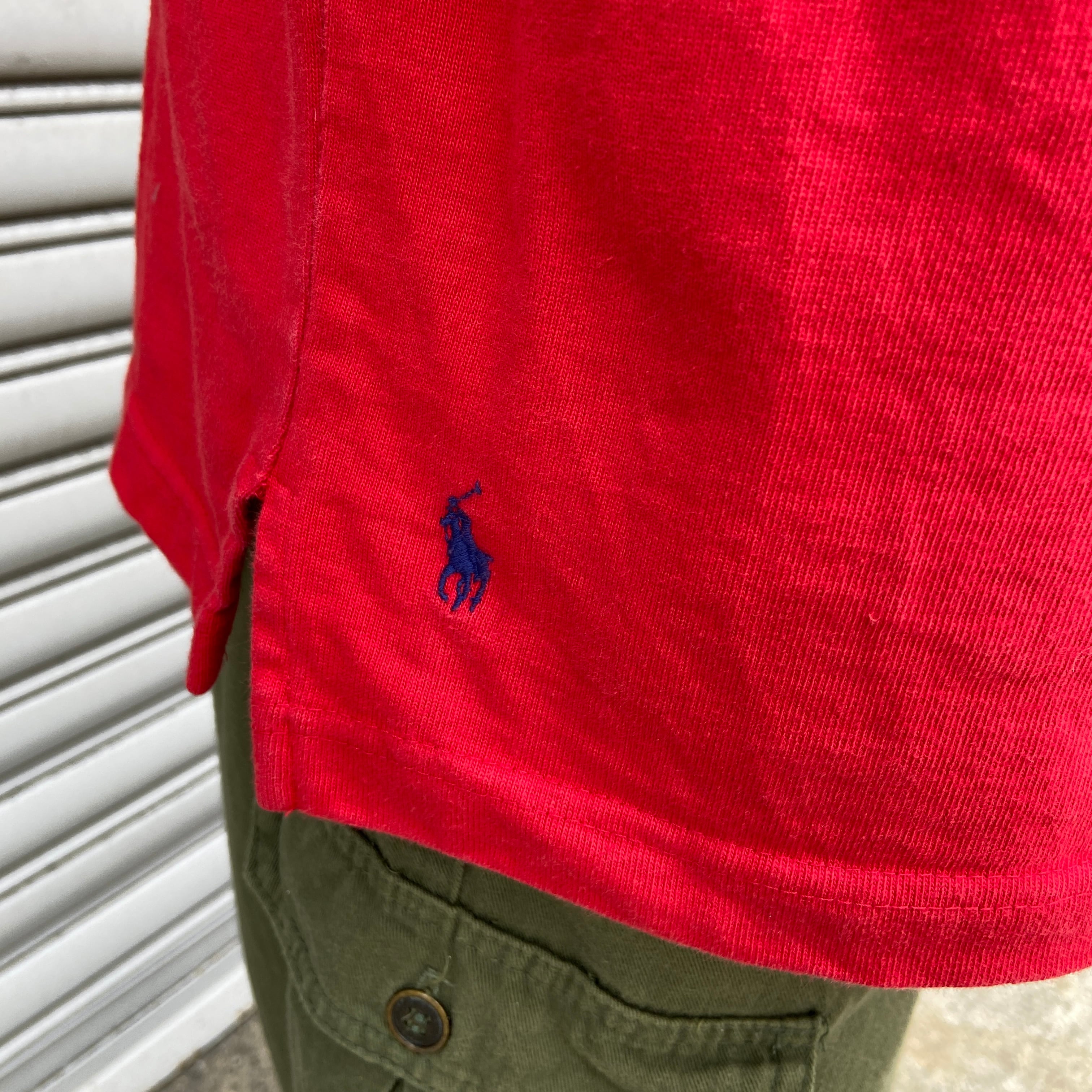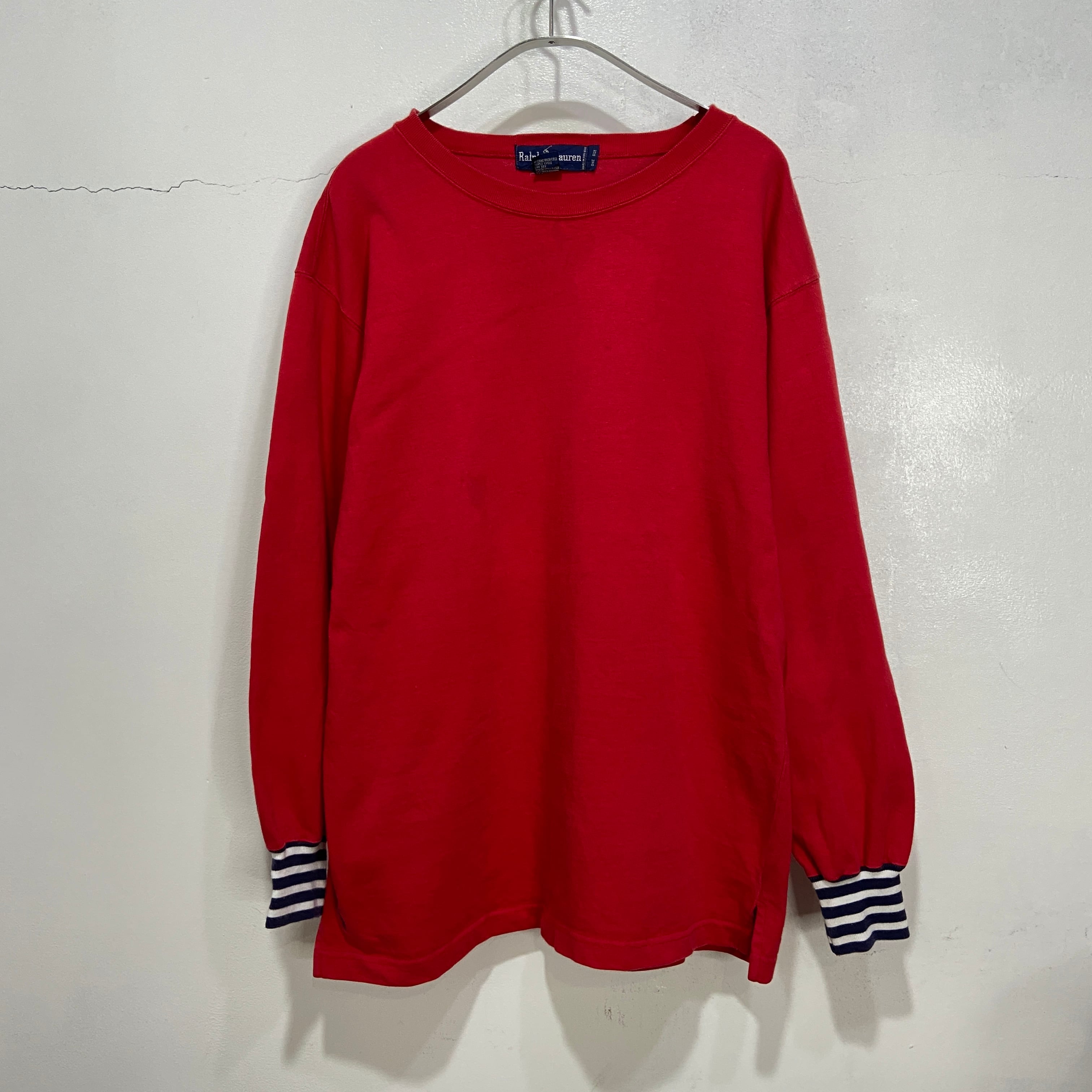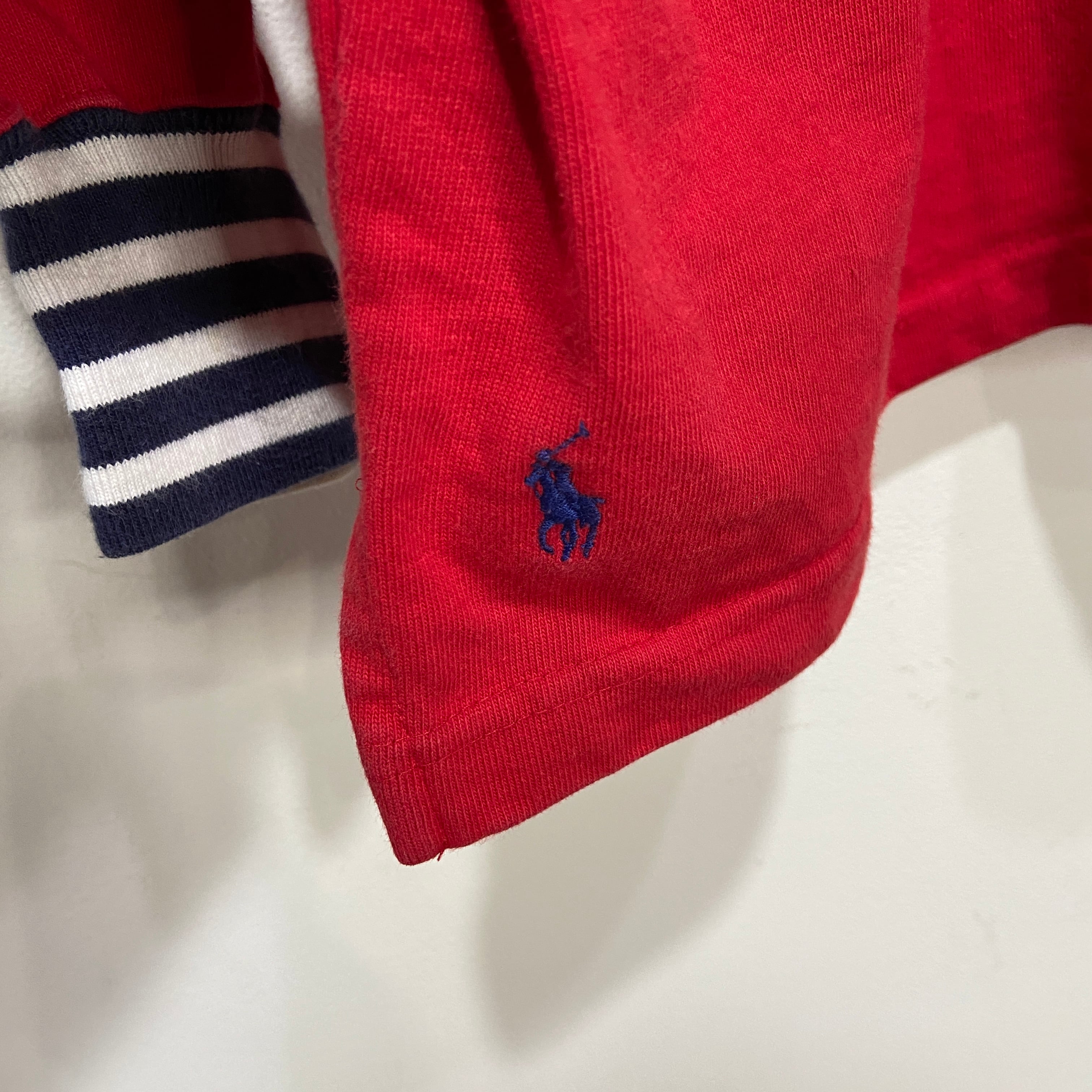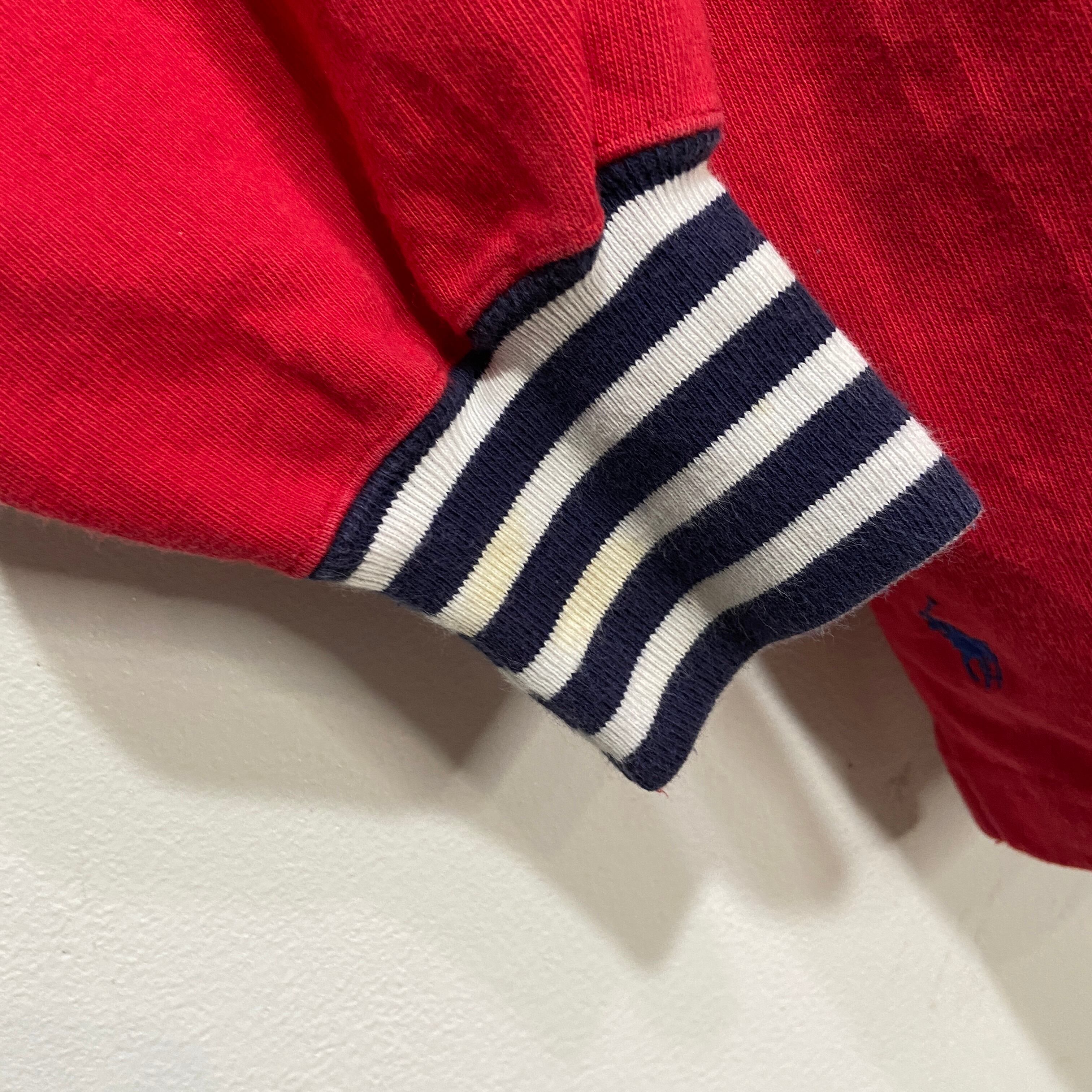 90s RalphLauren ワンポイントロゴロンT 袖口ボーダー 赤 L相当