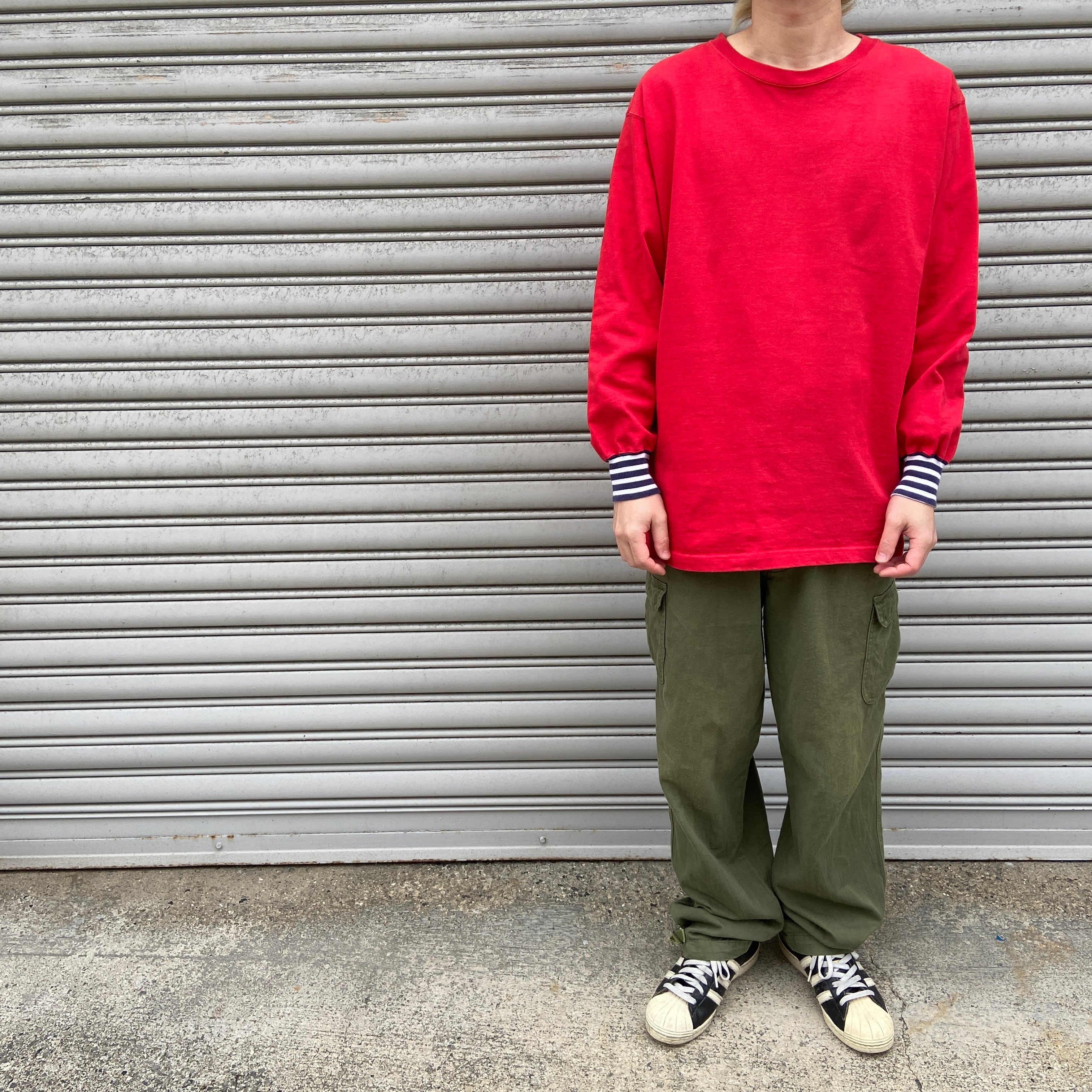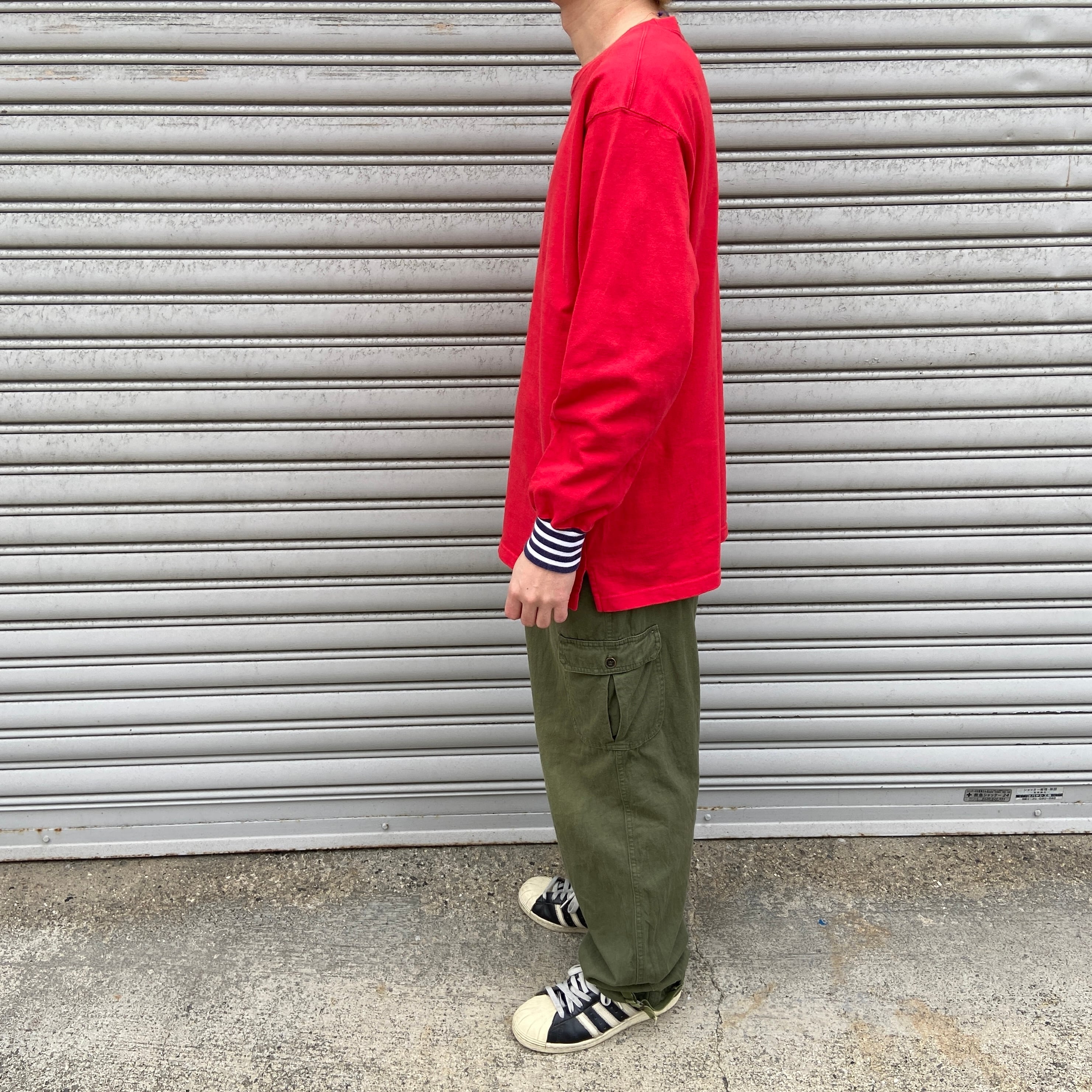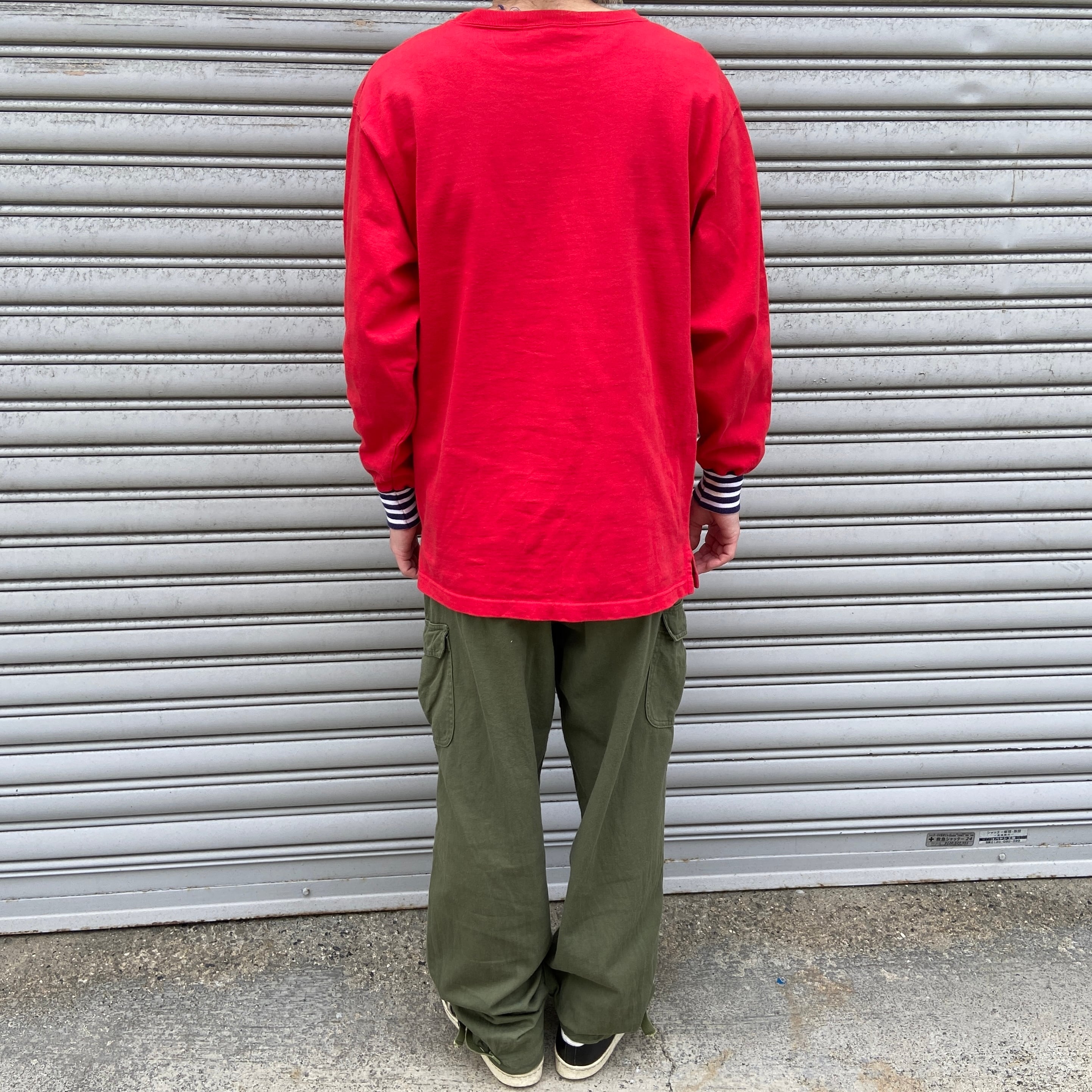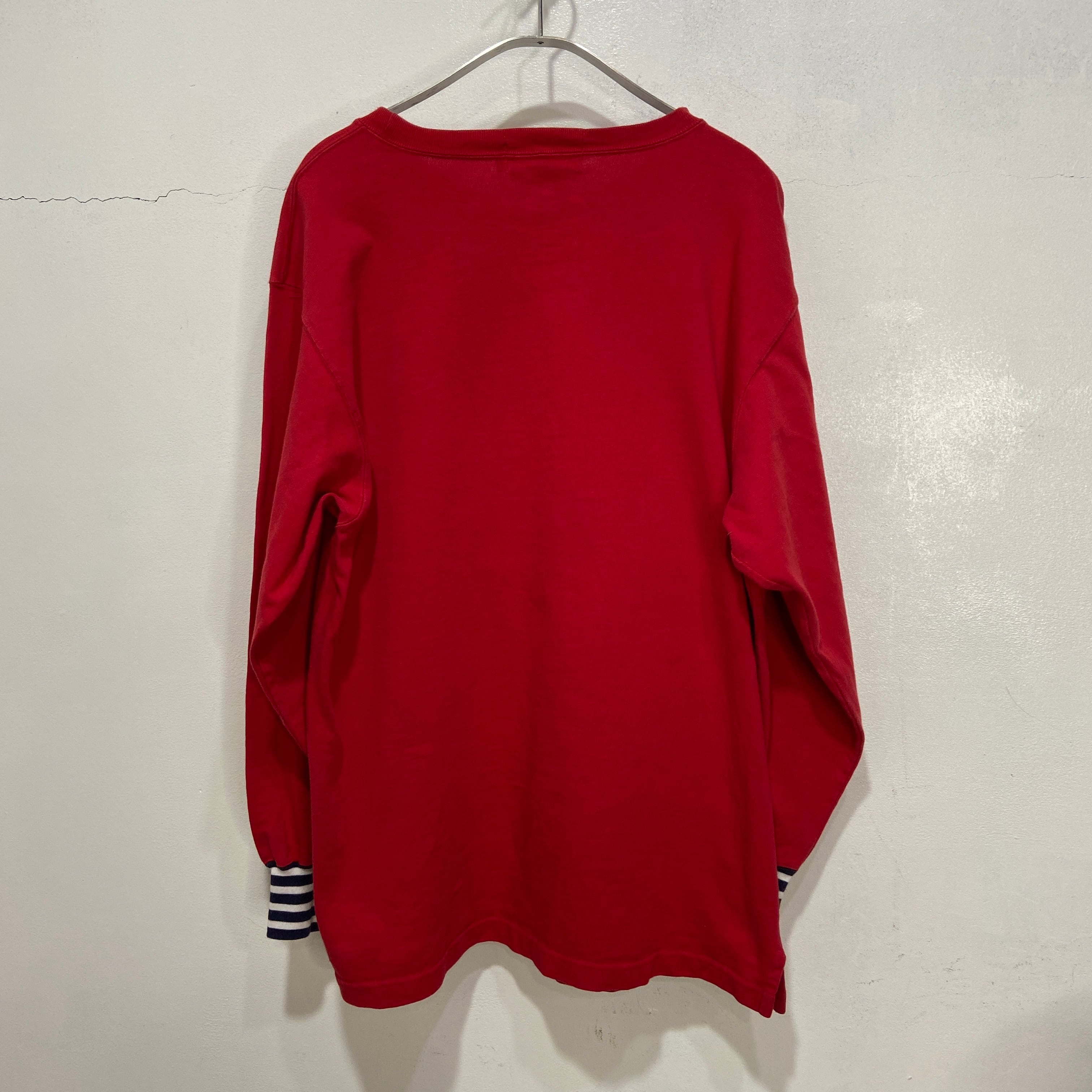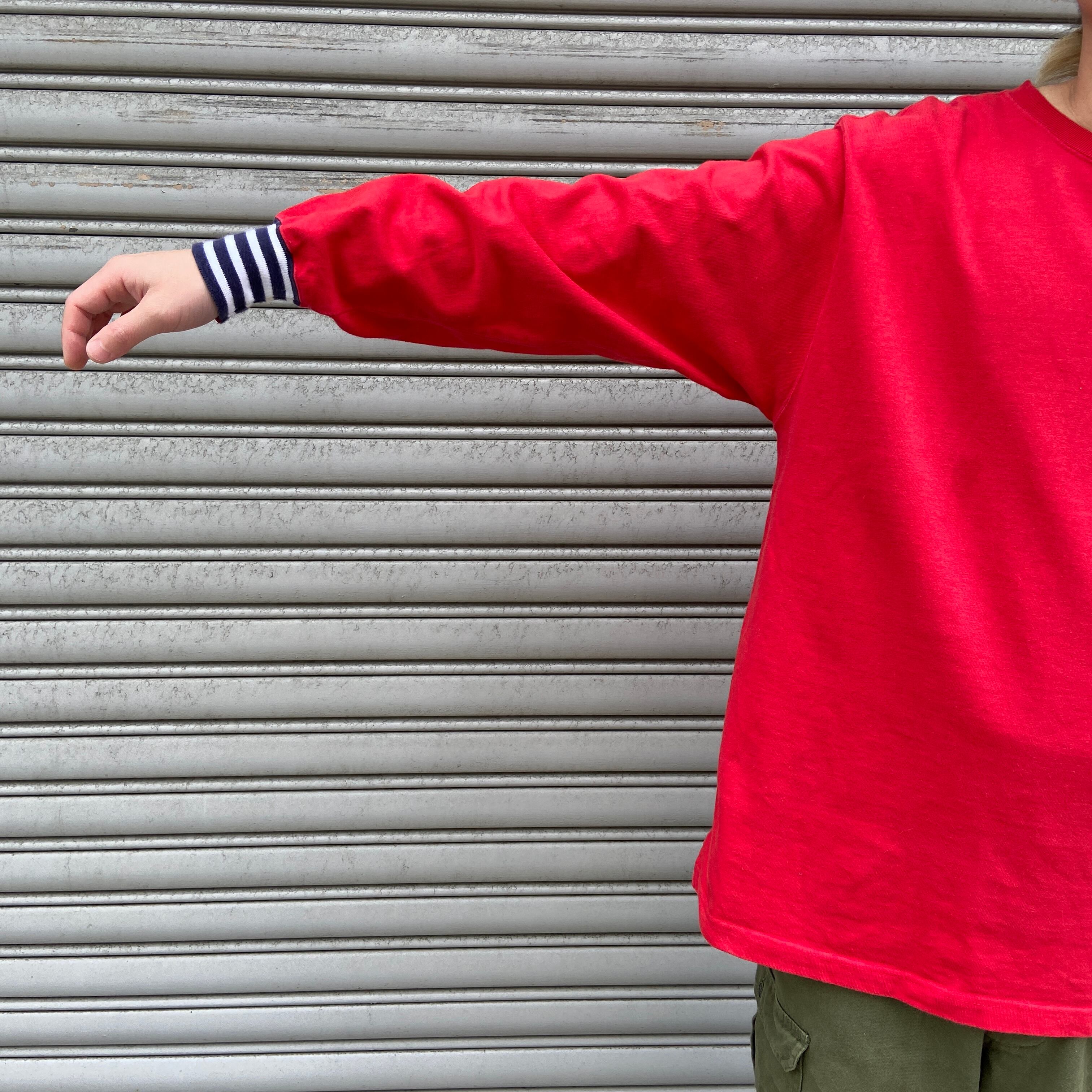 90s RalphLauren ワンポイントロゴロンT 袖口ボーダー 赤 L相当