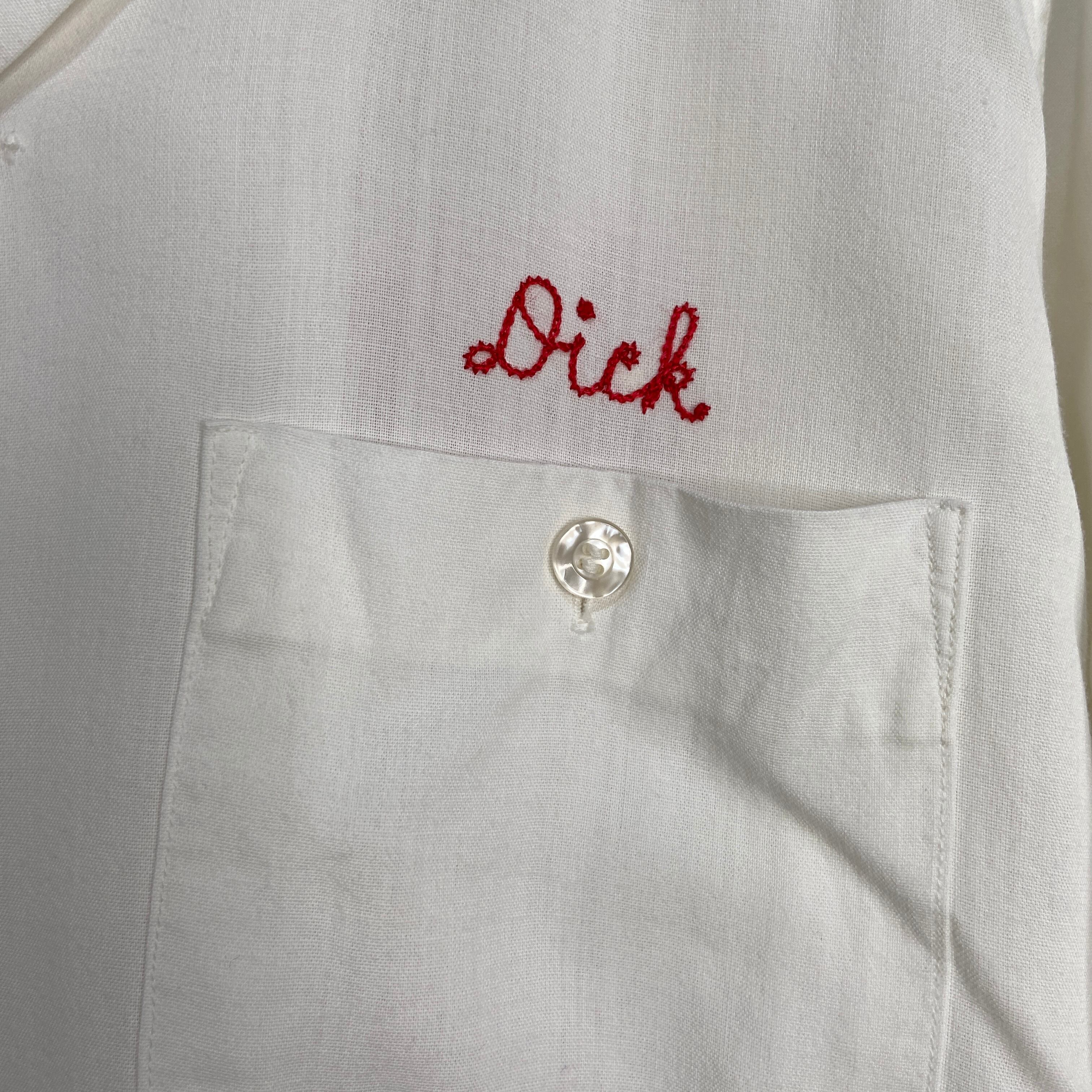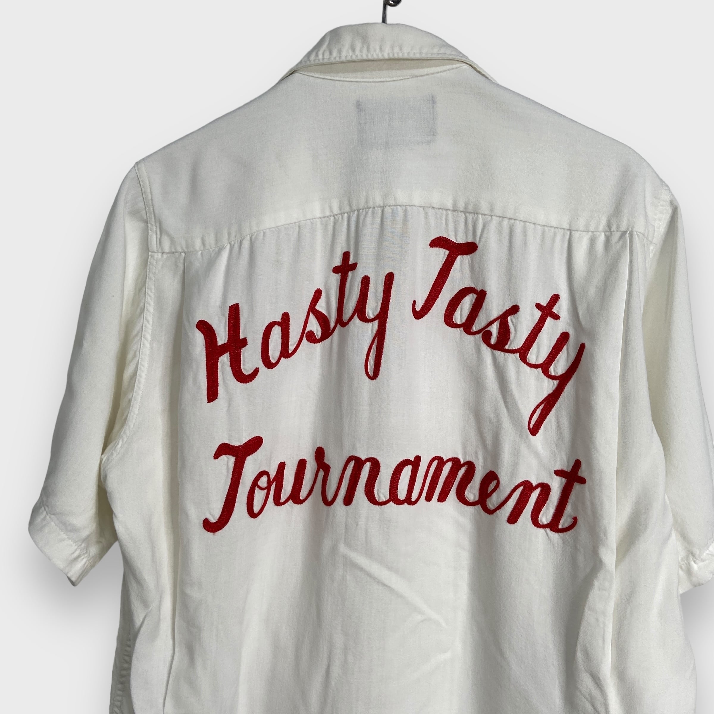 白地のレーヨンボディに赤糸チェーンステッチによるステッチワークが胸にワンポイント、背中に大きく入った素晴らしい1着!